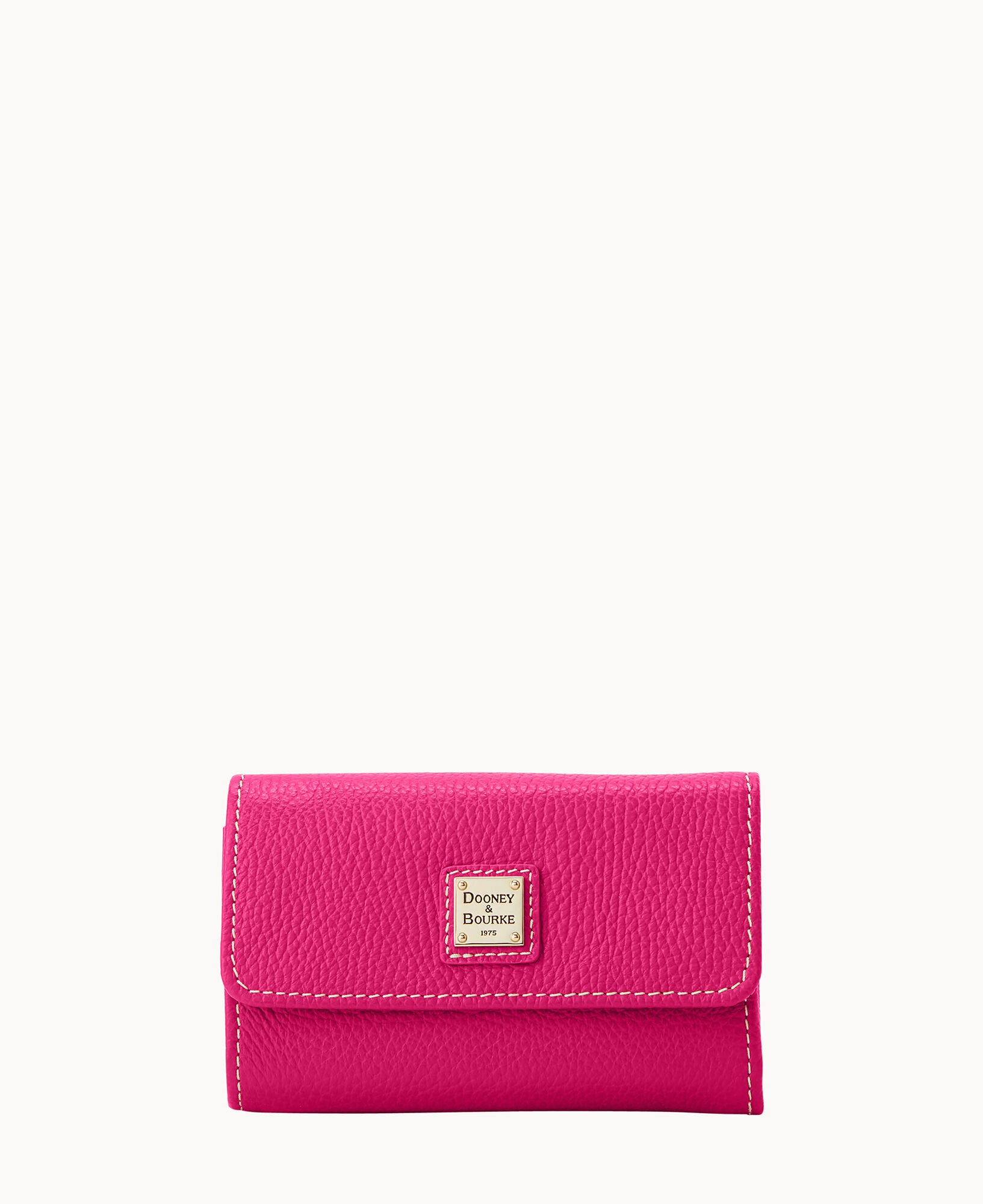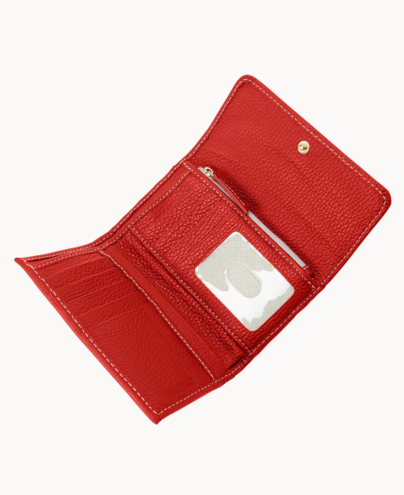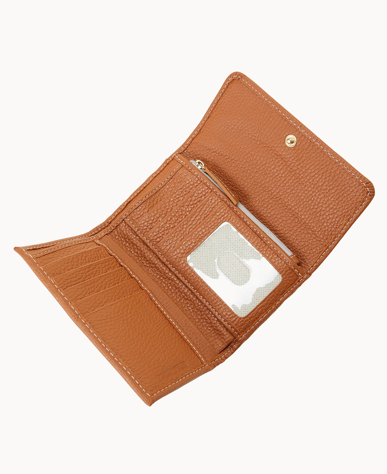 One inside zip pocket. ID window. Billfold compartment. Eight credit card slots. Flap closure.