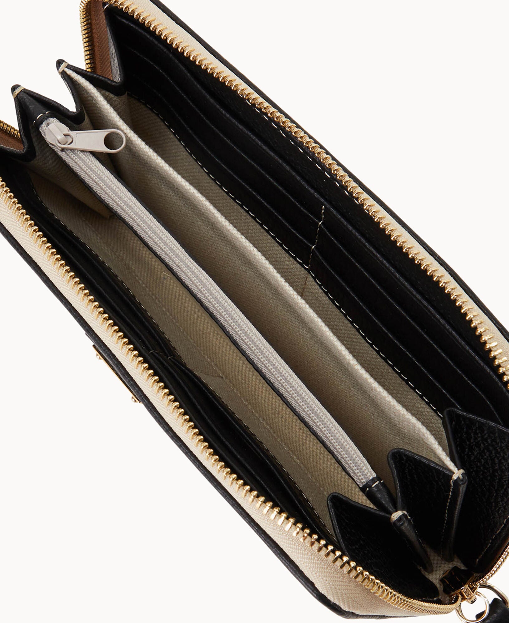Two compartments. One zip compartment. Twelve credit card slots. Detachable wrist strap. Strap length 7″. Lined. Zipper closure.