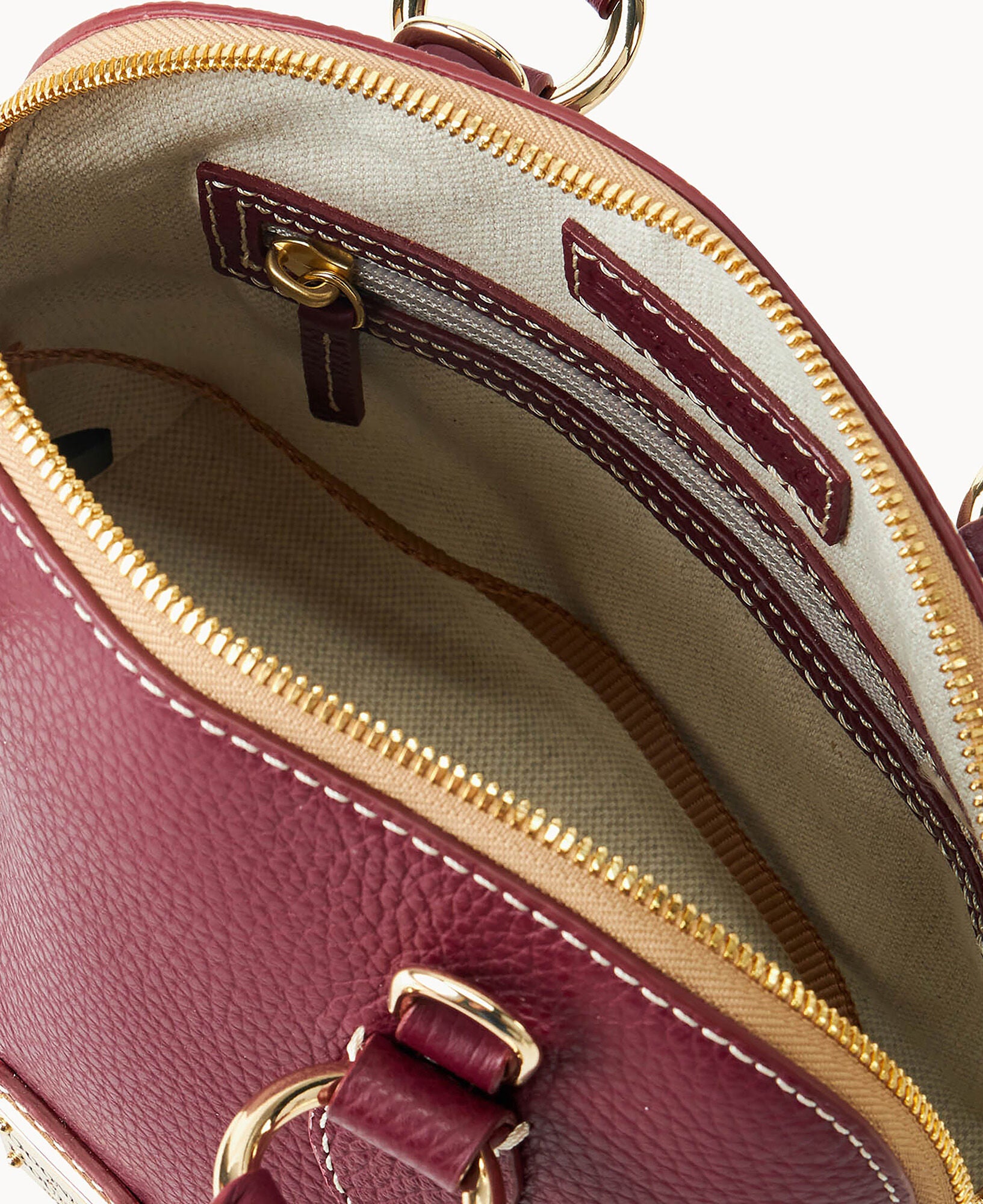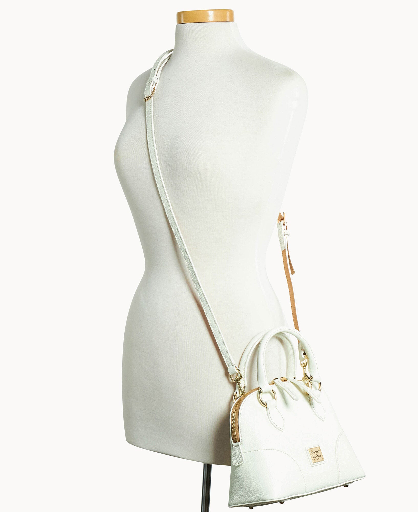 Inside zip pocket. Inside pocket. Inside key hook. Removable strap. Adjustable strap. Detachable strap. Lined. Feet. Zipper closure. Strap drop length 27″.