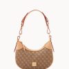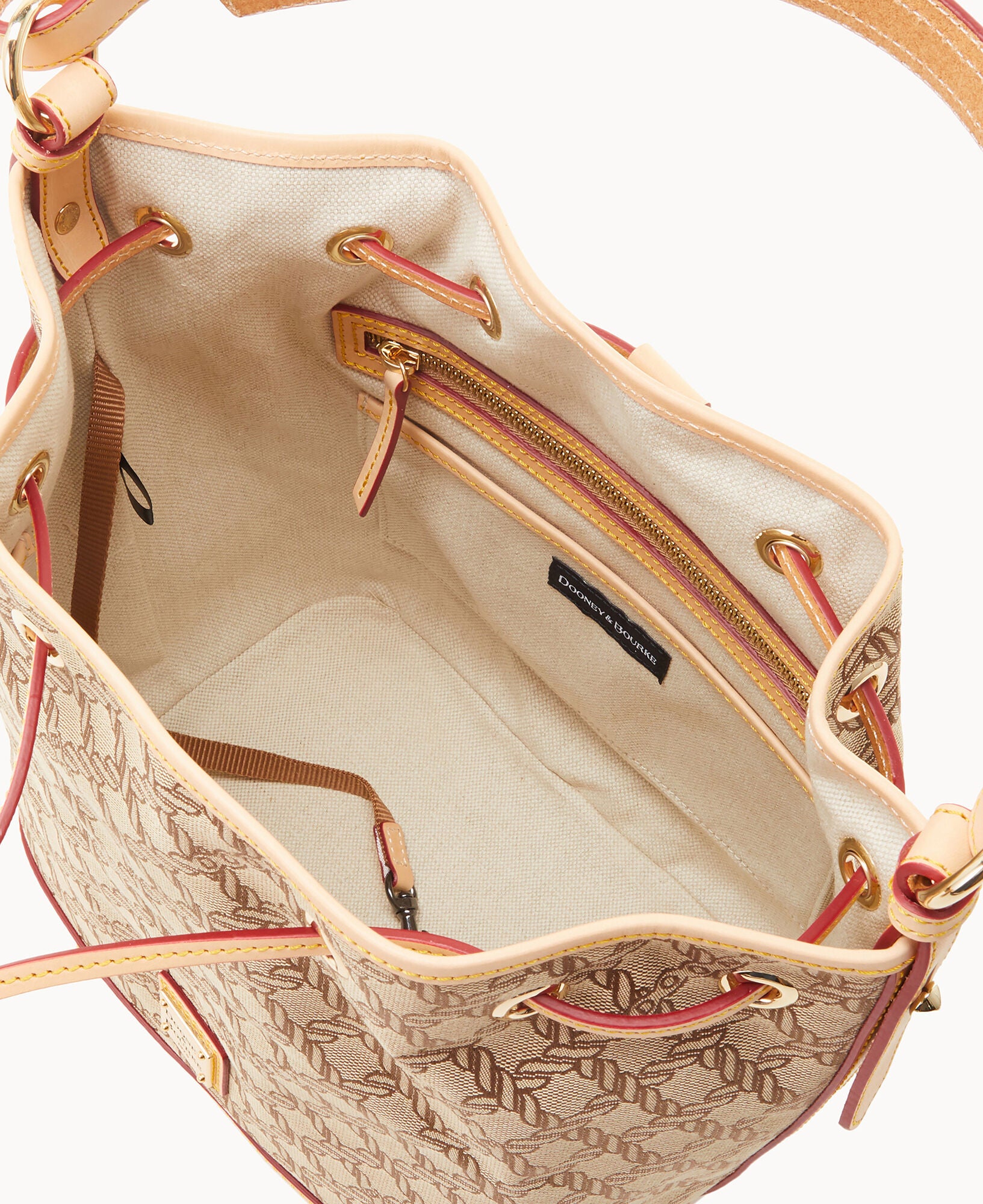 Two inside slip pockets. One inside phone pocket. One inside zip pocket. Inside key hook. Strap drop length 12″. Detachable strap. Feet. Lined. Drawstring closure.