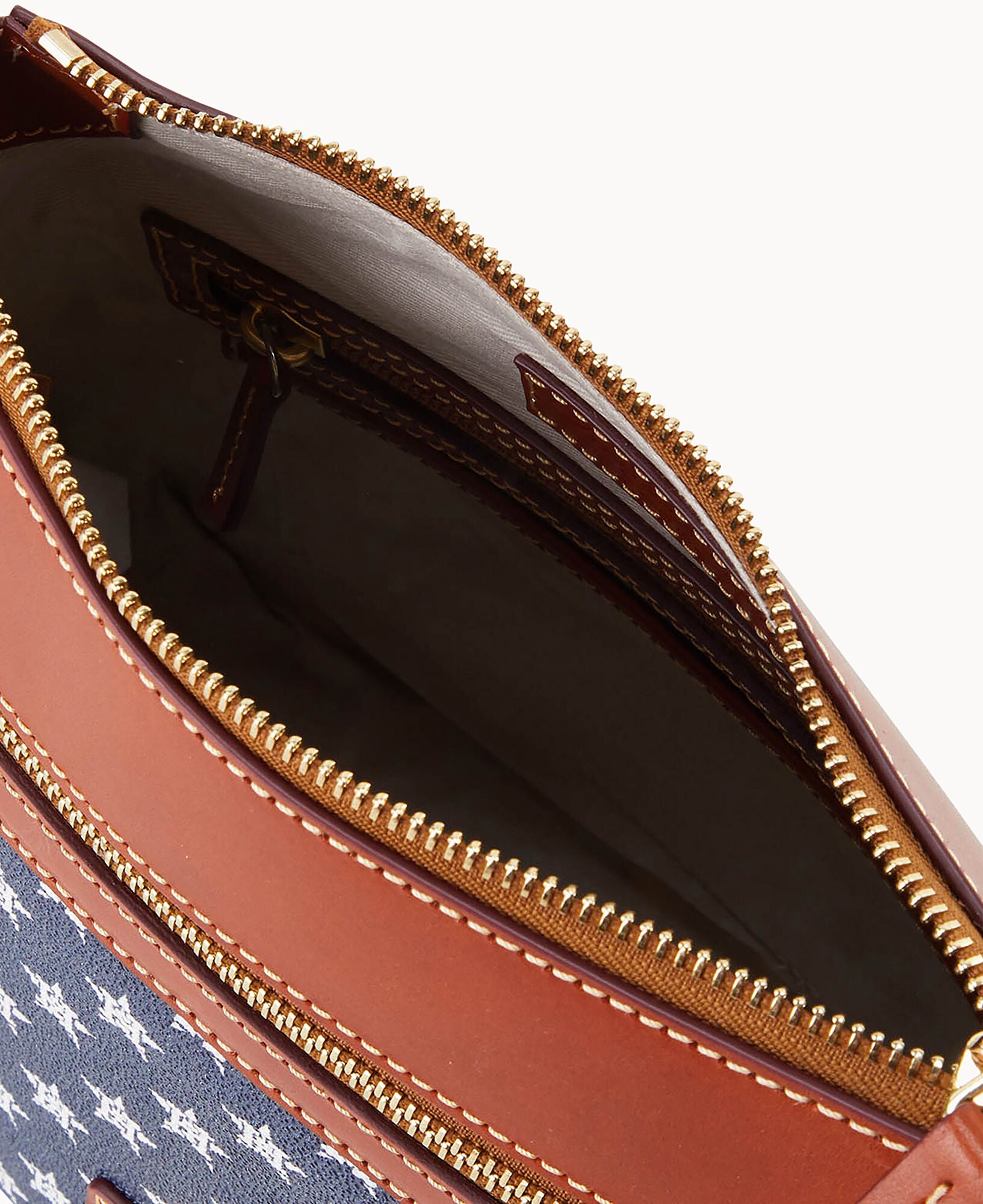 One outside zip pocket. One inside zip pocket. Two inside pockets. Adjustable, detachable shoulder strap. Strap drop length 27″. Inside key hook. Lined. Zipper closure.