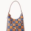 One outside zip pocket. One inside zip pocket. Two inside pockets. Cell phone pocket. Inside key hook. Handle drop length 5″. Adjustable, detachable shoulder strap. Strap drop length 21″. Lined. Feet. Zipper closure.