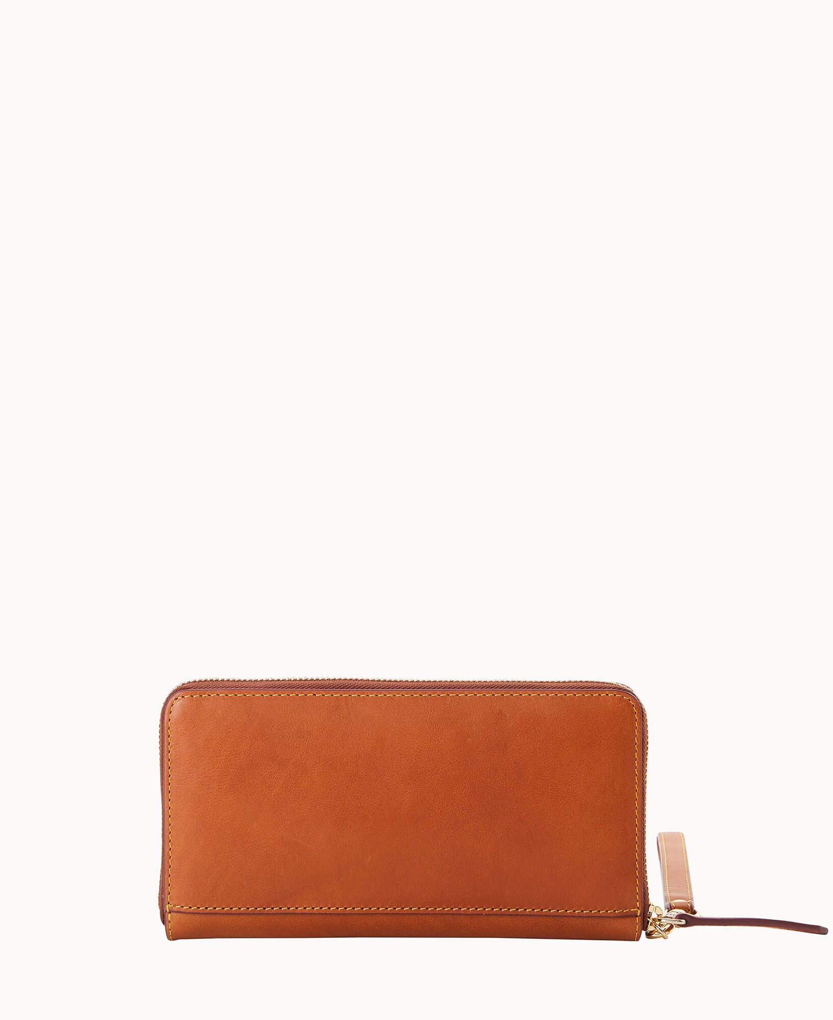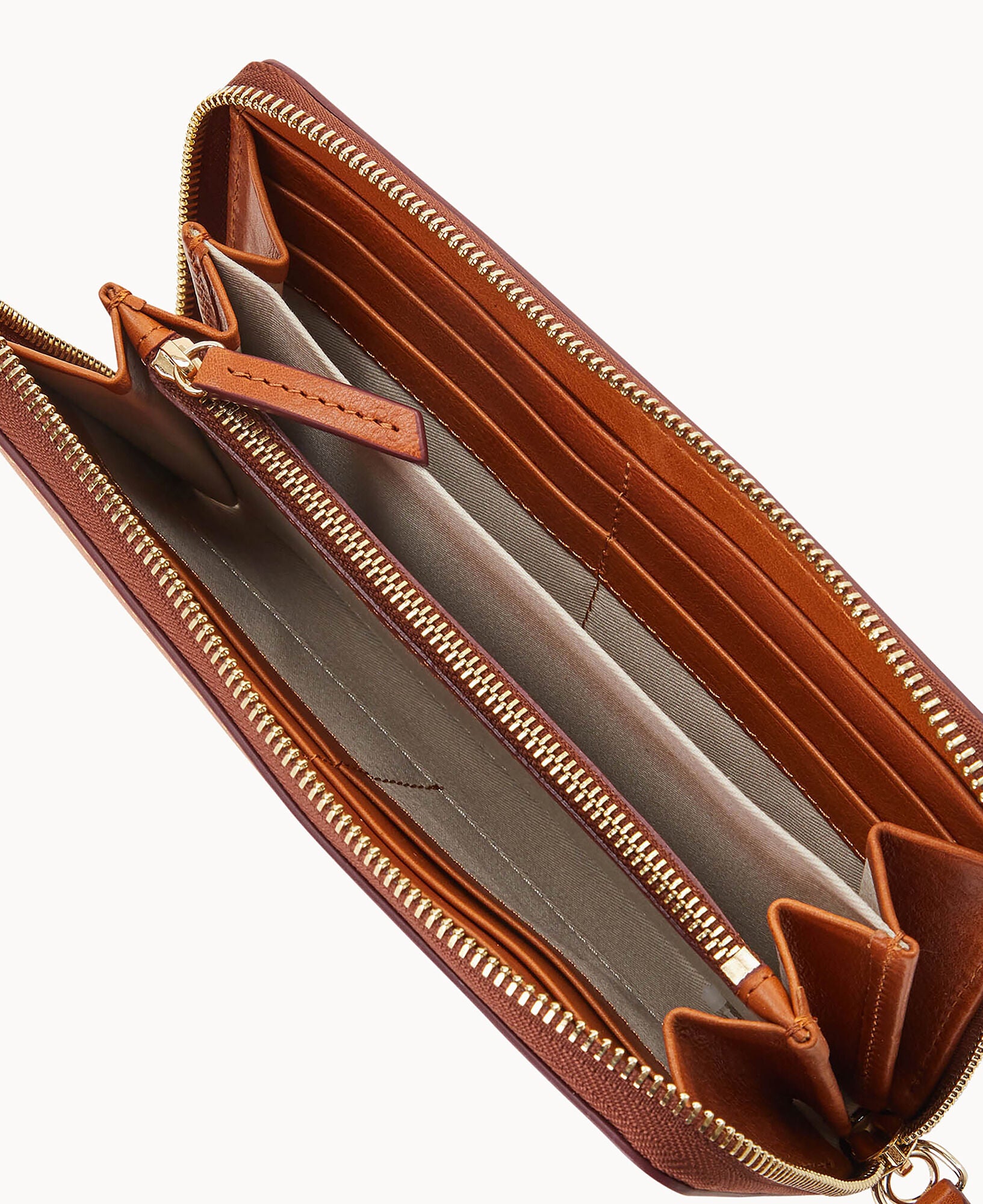 Two compartments. One zip compartment. Twelve credit card slots. Detachable wrist strap. Lined. Zipper closure.