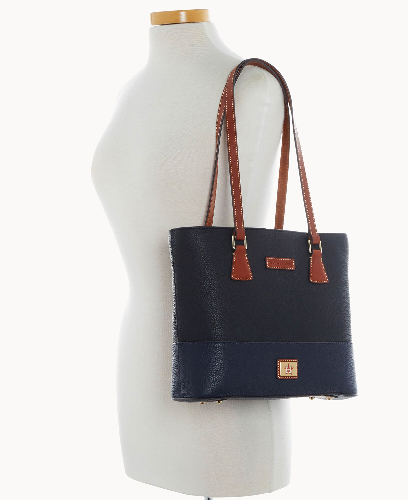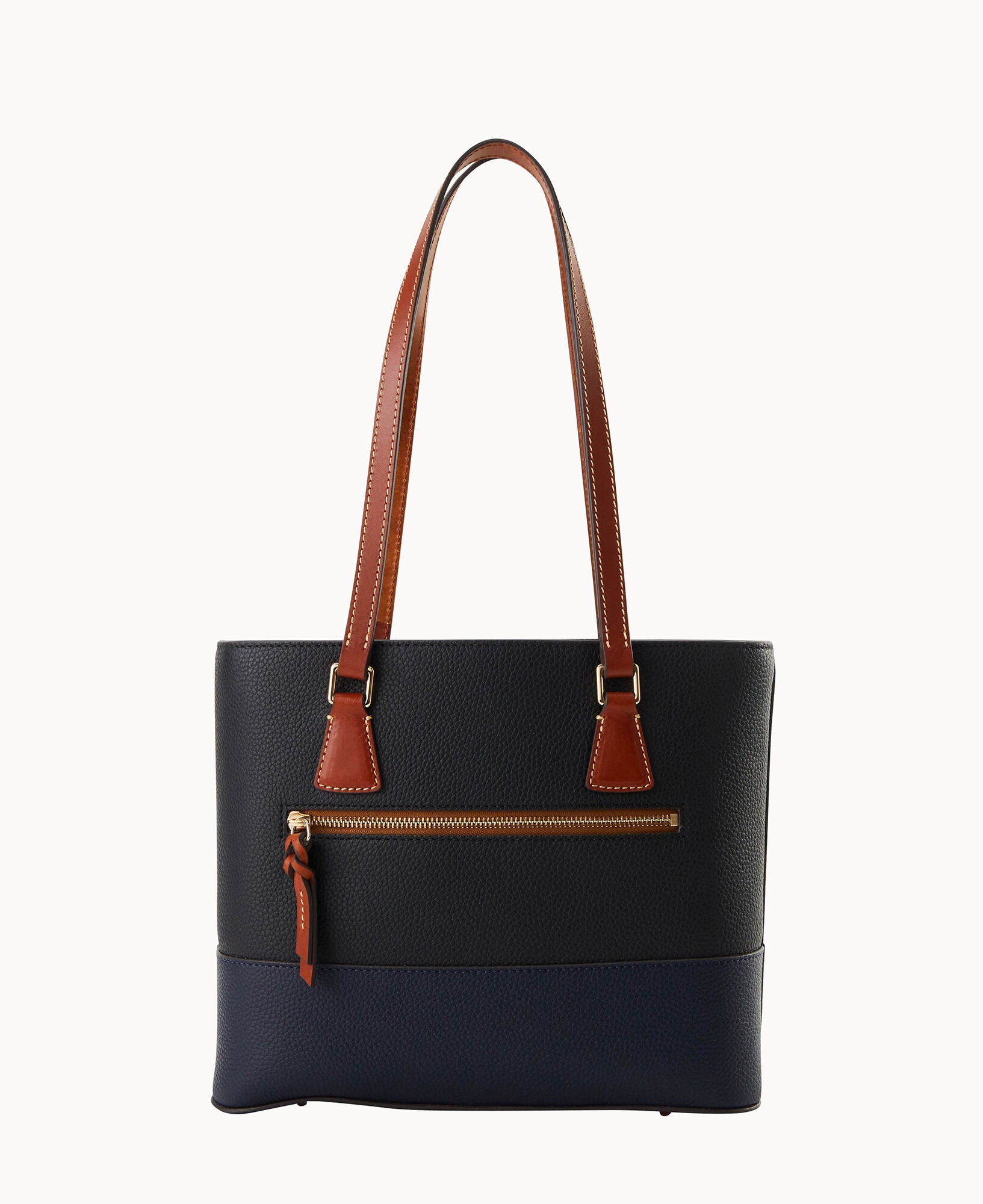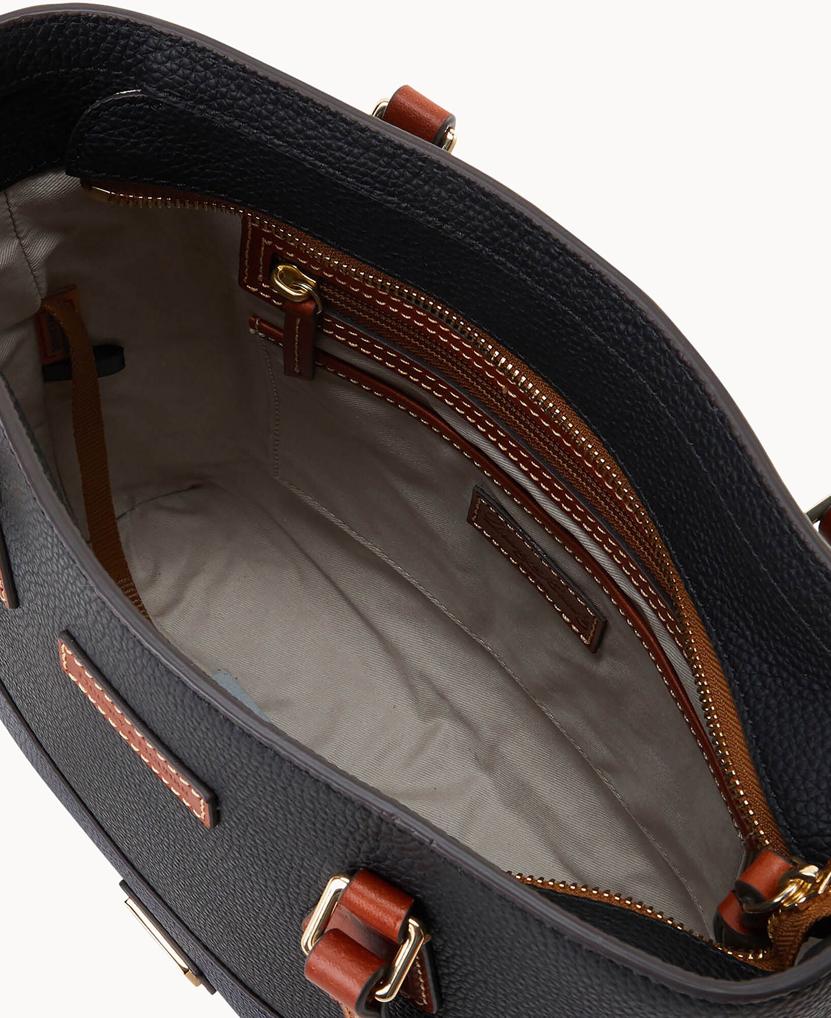 One outside zip pocket. Three inside pockets. One inside zip pocket. One inside key hook. Handle drop length 12″. Zipper closure. Feet. Lined.