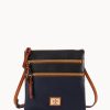 One inside zip pocket. Two inside pockets. Cell phone pocket. Inside key hook. Strap drop length 11″. Lined. Feet. Zipper closure.