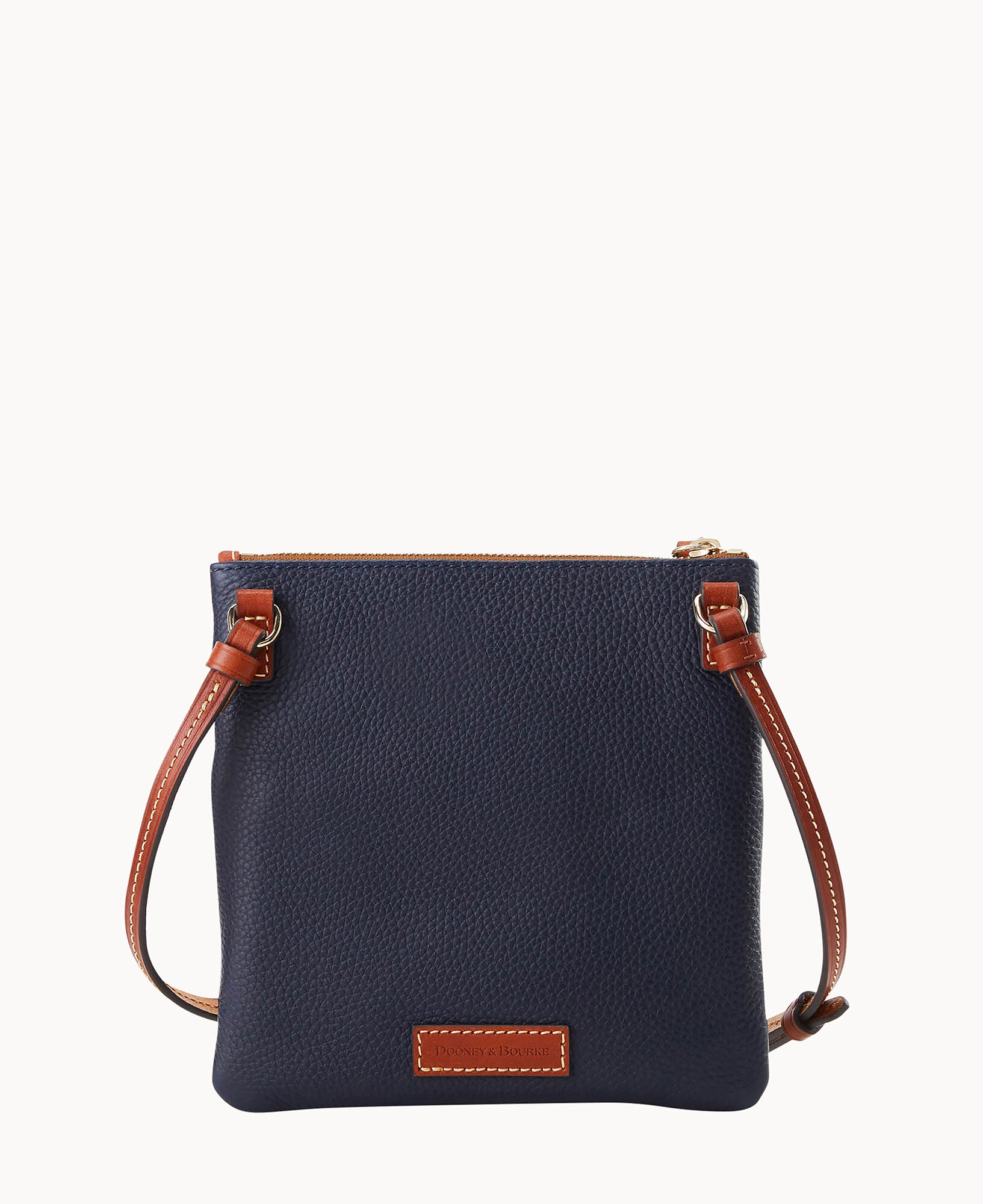 Two outside zip pockets. Cell phone pocket. Adjustable shoulder strap. Strap drop length 24″. Lined. Zipper closure.