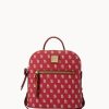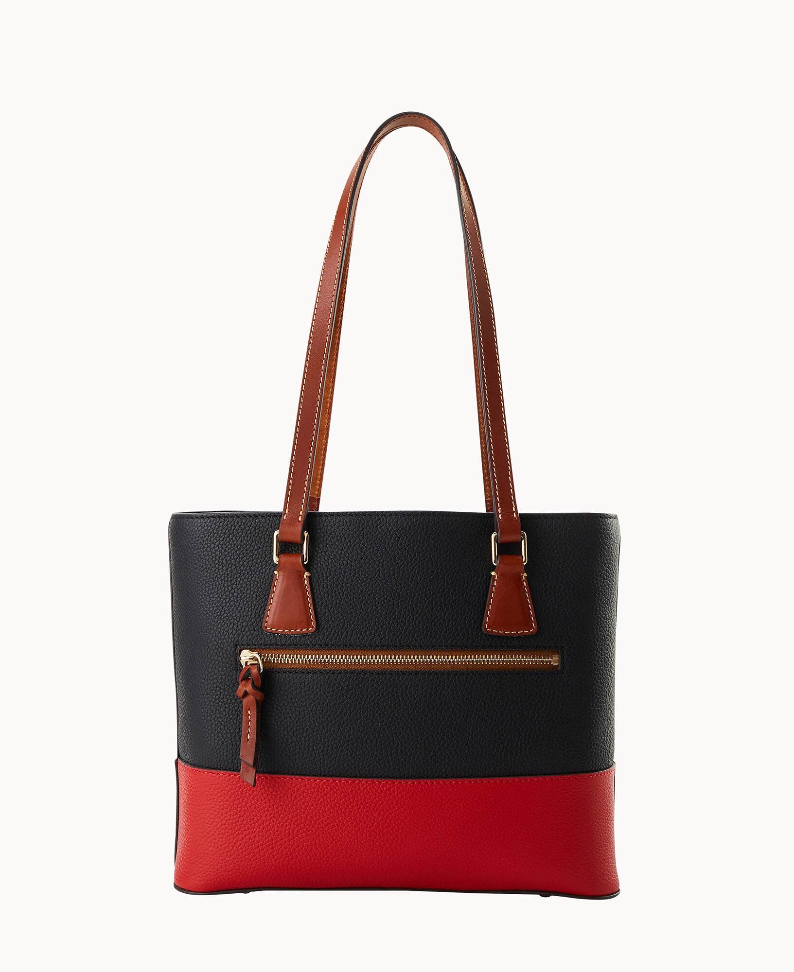 One outside zip pocket. Three inside pockets. One inside zip pocket. One inside key hook. Handle drop length 12″. Zipper closure. Feet. Lined.