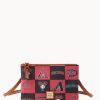 Two inside slip pockets. Inside key hook. Strap drop length 11″. Lined. Feet. Zipper closure.