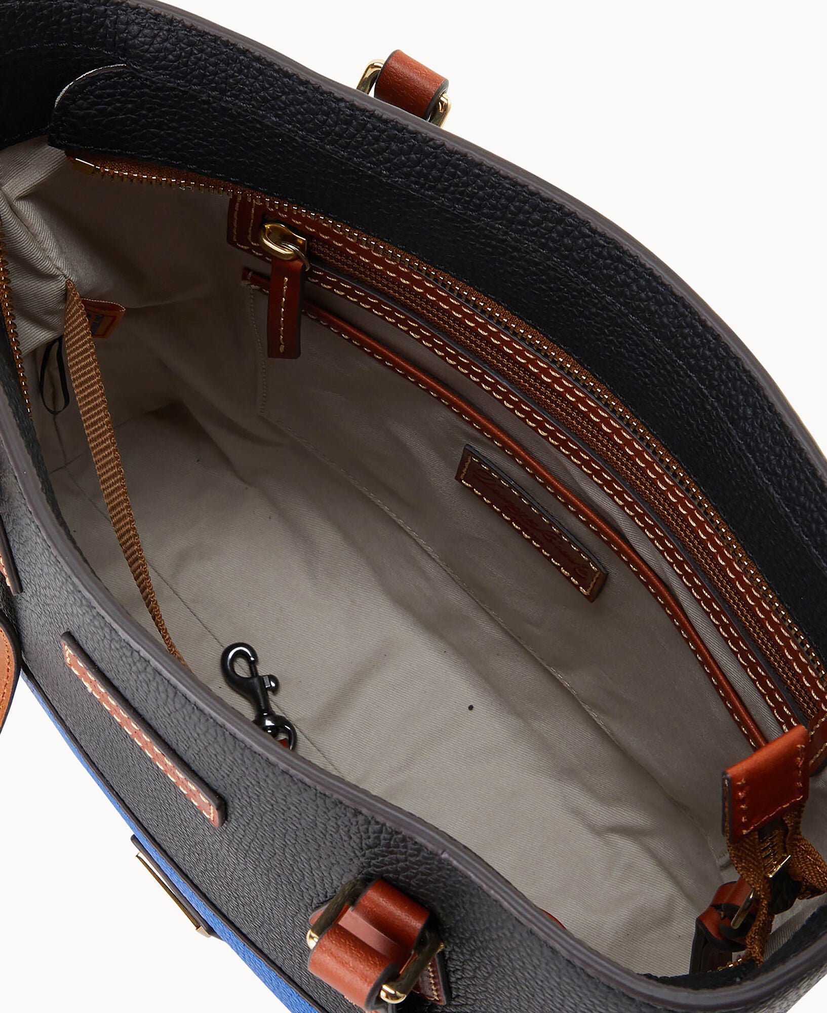 One outside zip pocket. Three inside pockets. One inside zip pocket. One inside key hook. Handle drop length 12″. Zipper closure. Feet. Lined.