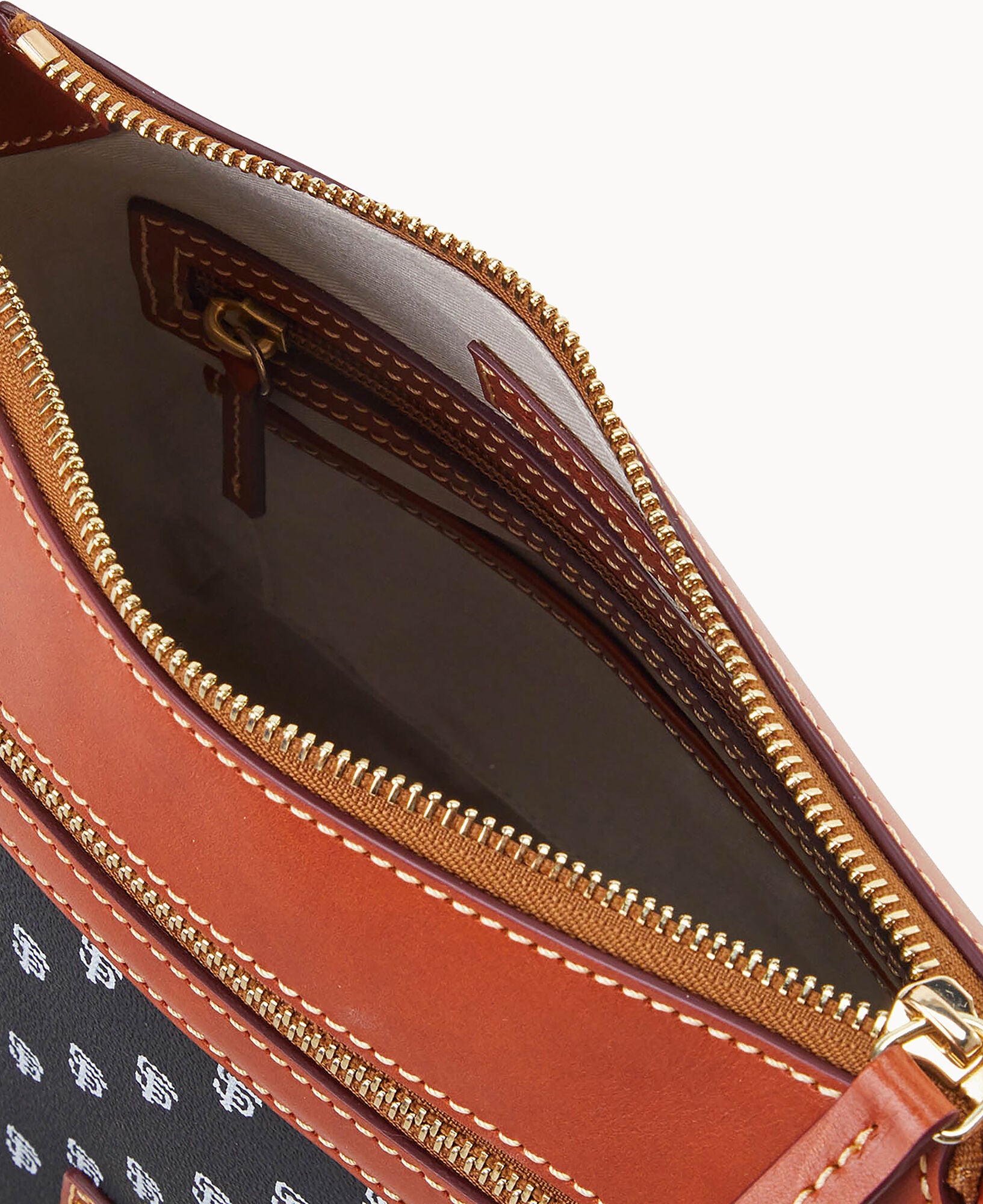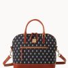 One outside zip pocket. One inside zip pocket. Two inside pockets. Adjustable, detachable shoulder strap. Strap drop length 27″. Inside key hook. Lined. Zipper closure.