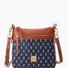 One outside zipper pocket. Two inside pockets. One inside cell phone pocket. One inside zipper pocket. Inside key hook. Strap drop length 9.75″. Zipper closure. Lined. Feet.