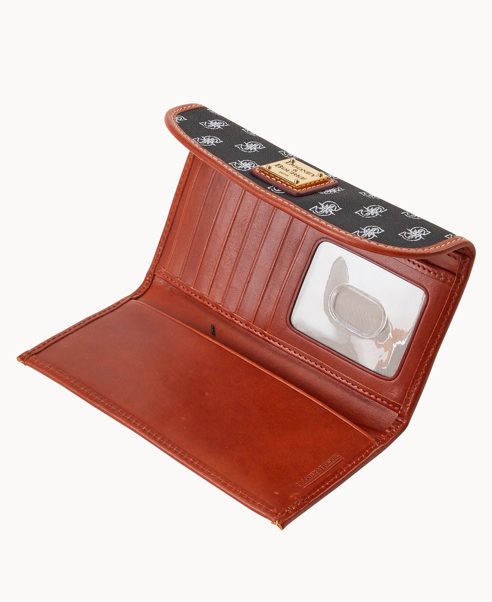 One outside zip pocket. One inside pocket. License pocket with window. Two bill compartments. Seven credit card slots. Lined. Feet. Snap closure.