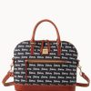 One outside zip pocket. One inside zip pocket. Two inside pockets. Cell phone pocket. Inside key hook. Handle drop length 13″. Lined. Zipper closure.