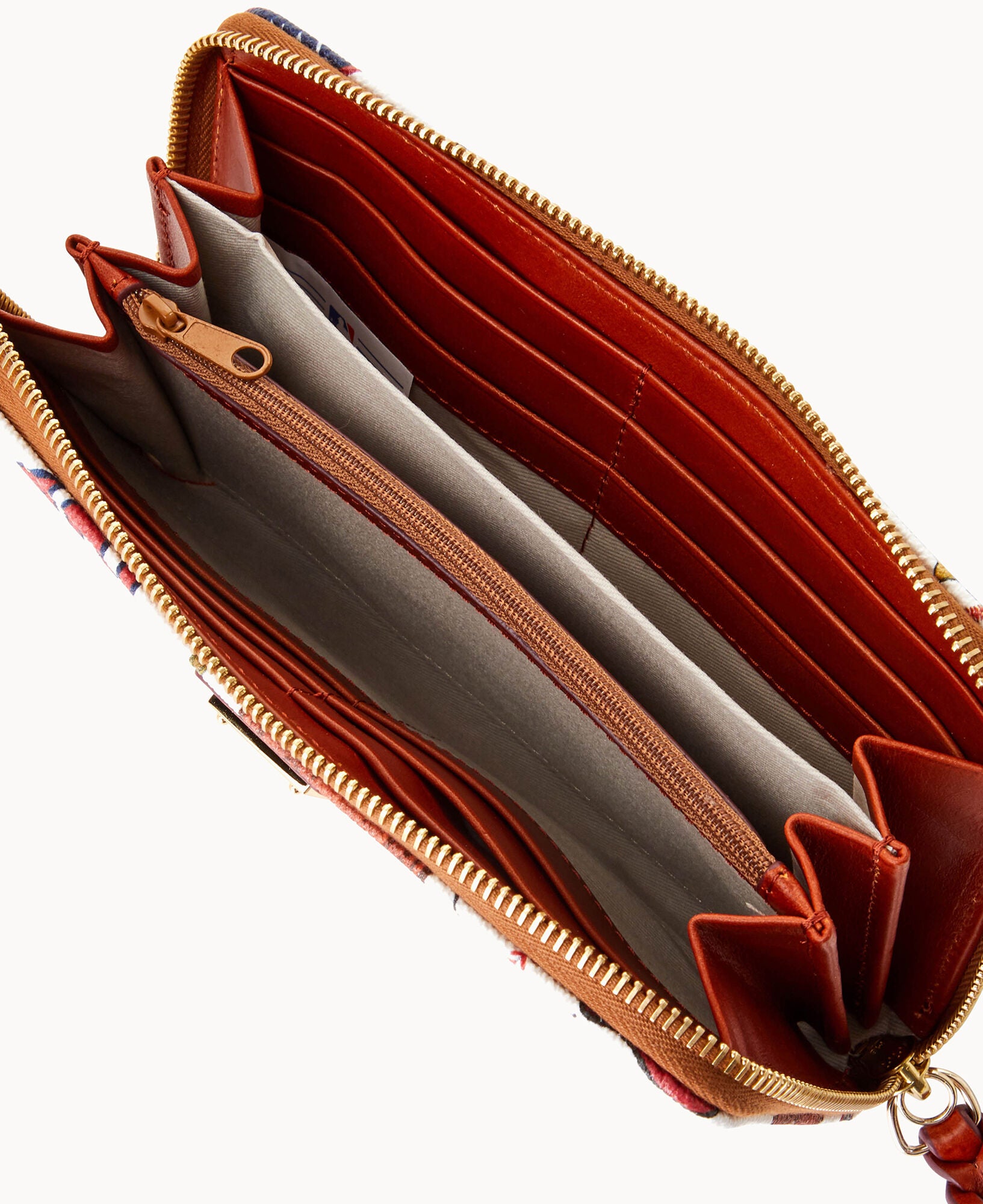 Two compartments. One zip compartment. Twelve credit card slots. Detachable wrist strap. Strap length 7″. Lined. Zipper closure.