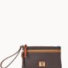 One inside pocket. Four credit card slots. Detachable wrist strap. Lined. Zipper closure.