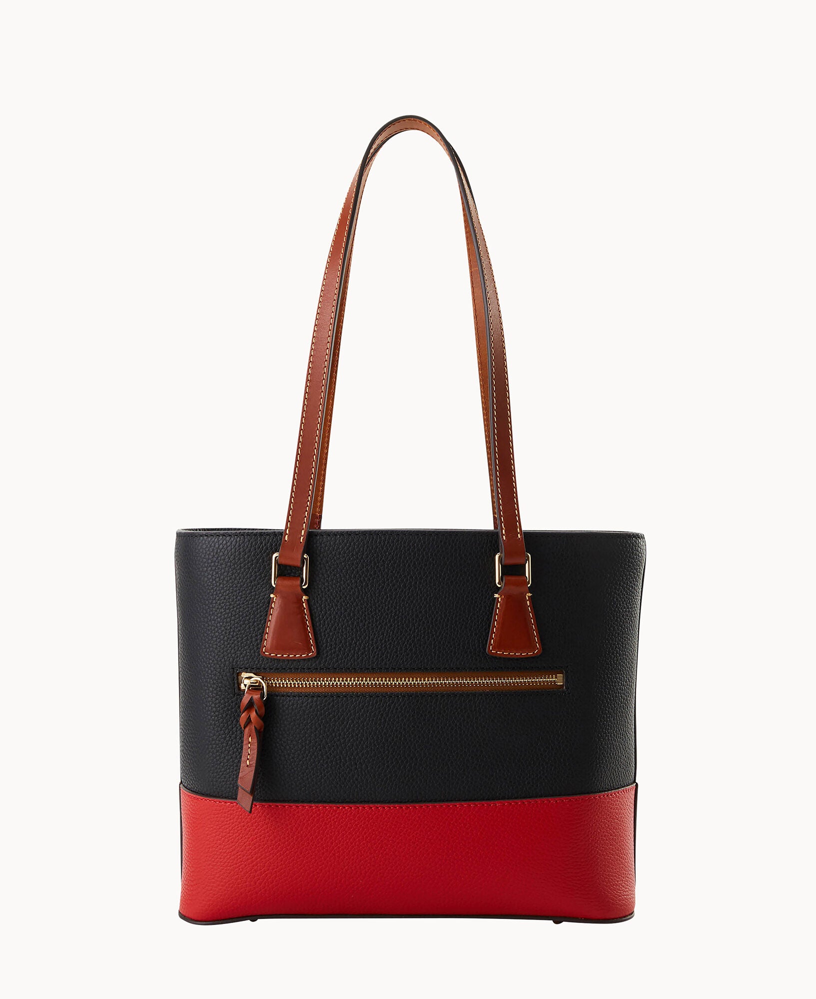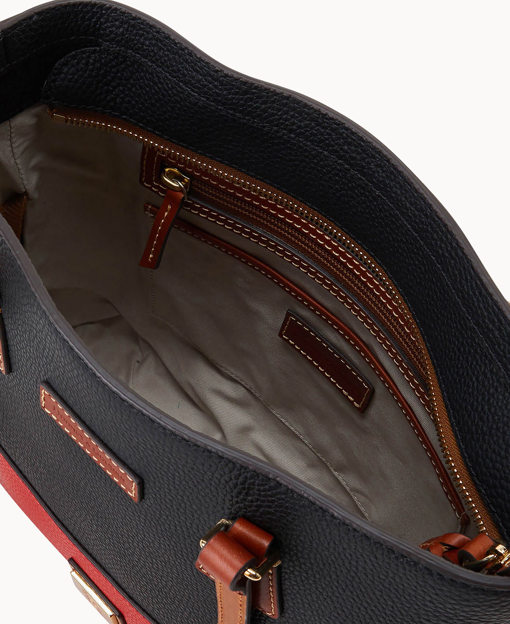 One outside zip pocket. Three inside pockets. One inside zip pocket. One inside key hook. Handle drop length 12″. Zipper closure. Feet. Lined.