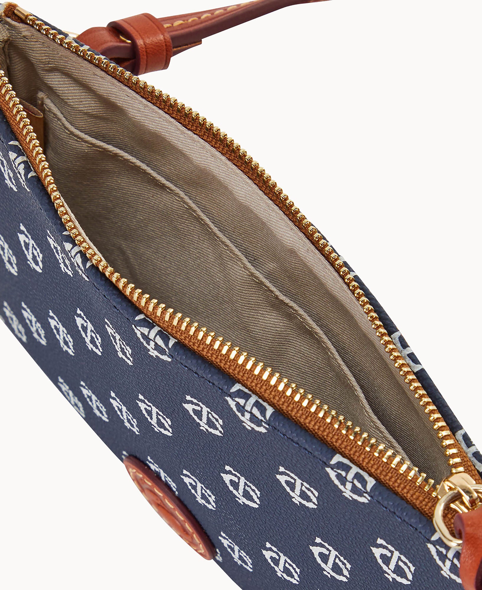 One inside zip pocket. Two inside pockets. Cell phone pocket. Inside key hook. Strap drop length 21″. Lined. Feet. Zipper closure.