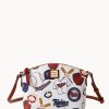 Two outside zip pockets. Cell phone pocket. Adjustable shoulder strap. Strap drop length 24″. Lined. Zipper closure.