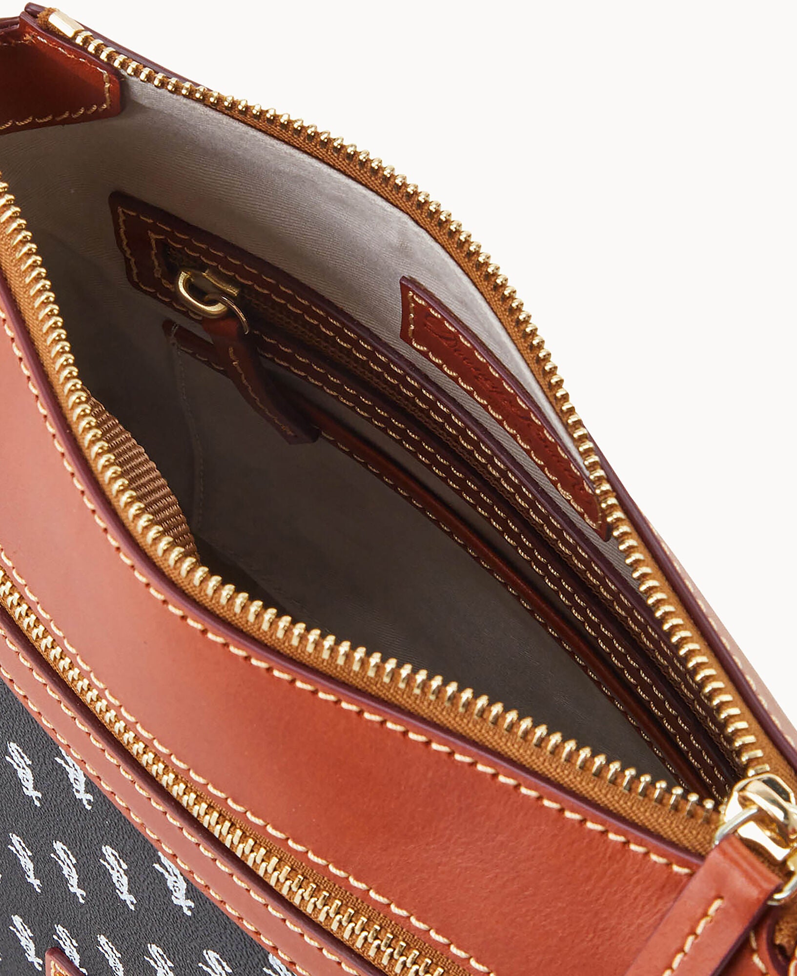 One outside zip pocket. One inside zip pocket. Two inside pockets. Adjustable, detachable shoulder strap. Strap drop length 27″. Inside key hook. Lined. Zipper closure.