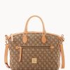 One inside zip pocket. Two inside pockets. Cell phone pocket. Inside key hook. Handle drop length 4″. Adjustable, detachable shoulder strap. Strap drop length 15.5″. Lined. Feet. Zipper closure.