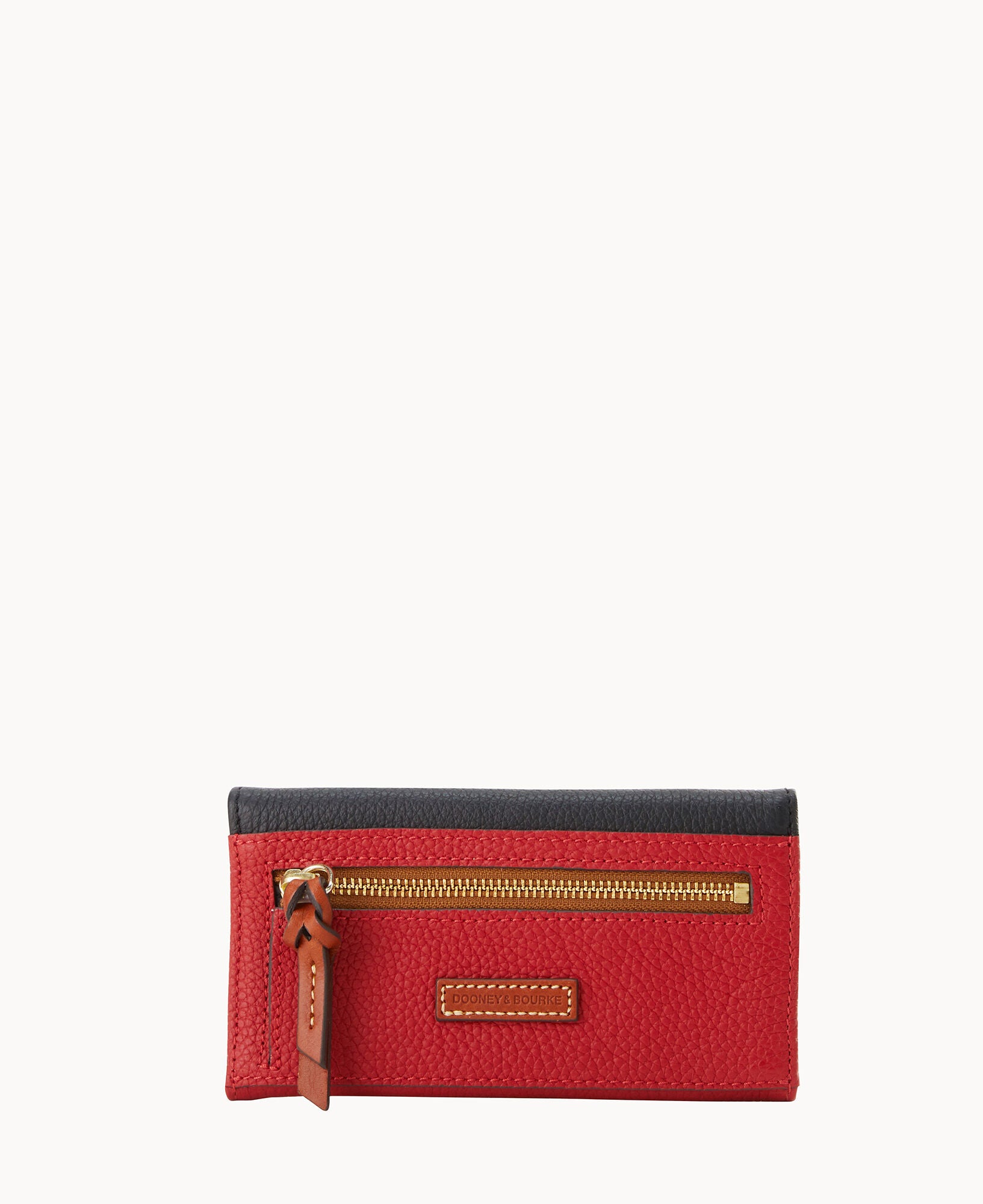 One outside zip pocket. One inside pocket. License pocket with window. Two bill compartments. Seven credit card slots. Lined. Feet. Snap closure.