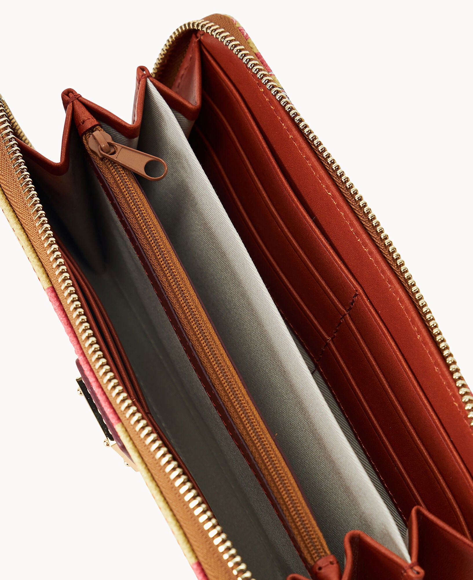 Two compartments. One zip compartment. Twelve credit card slots. Detachable wrist strap. Strap length 7″. Lined. Zipper closure.