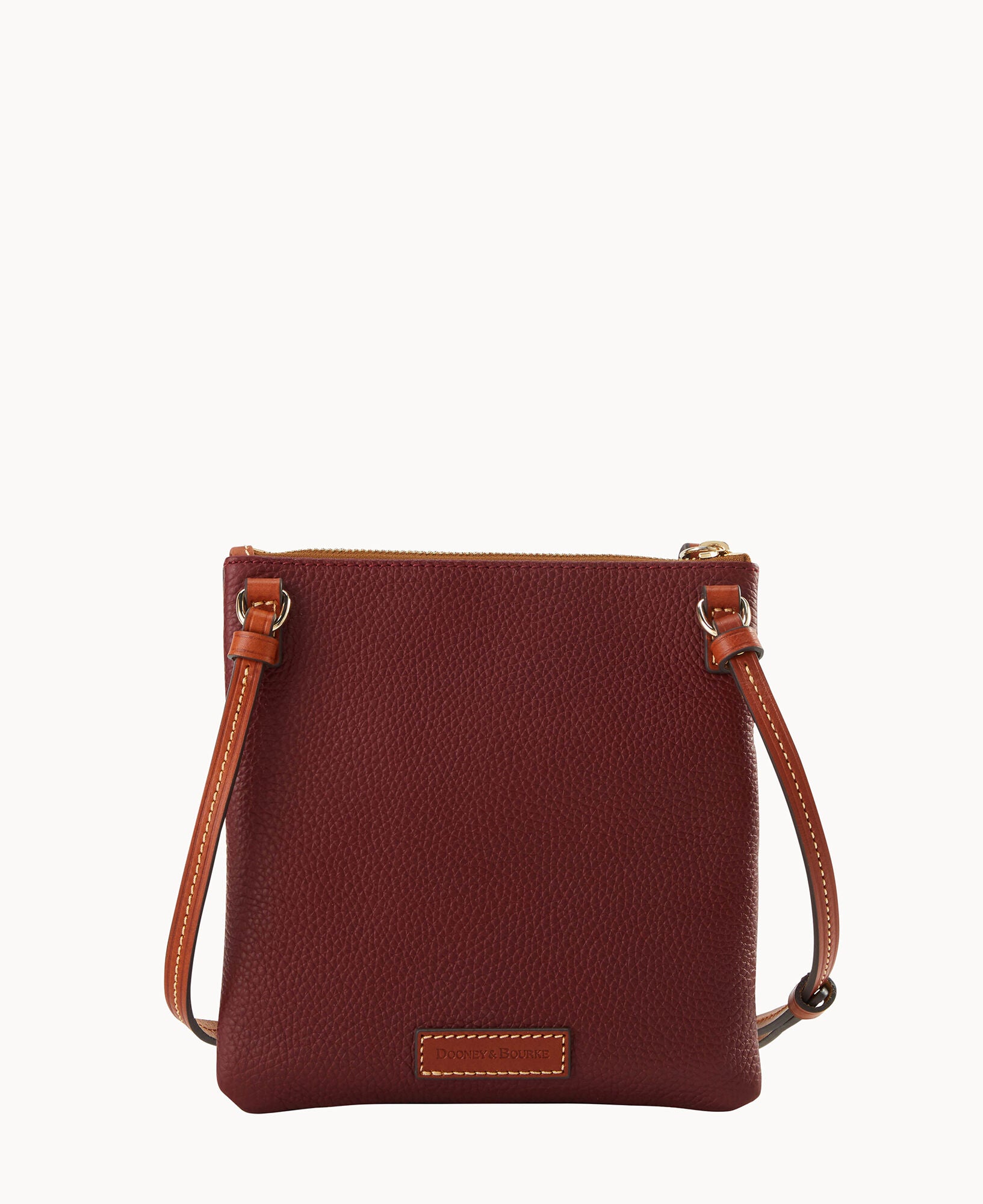 Two outside zip pockets. Cell phone pocket. Adjustable shoulder strap. Strap drop length 24″. Lined. Zipper closure.