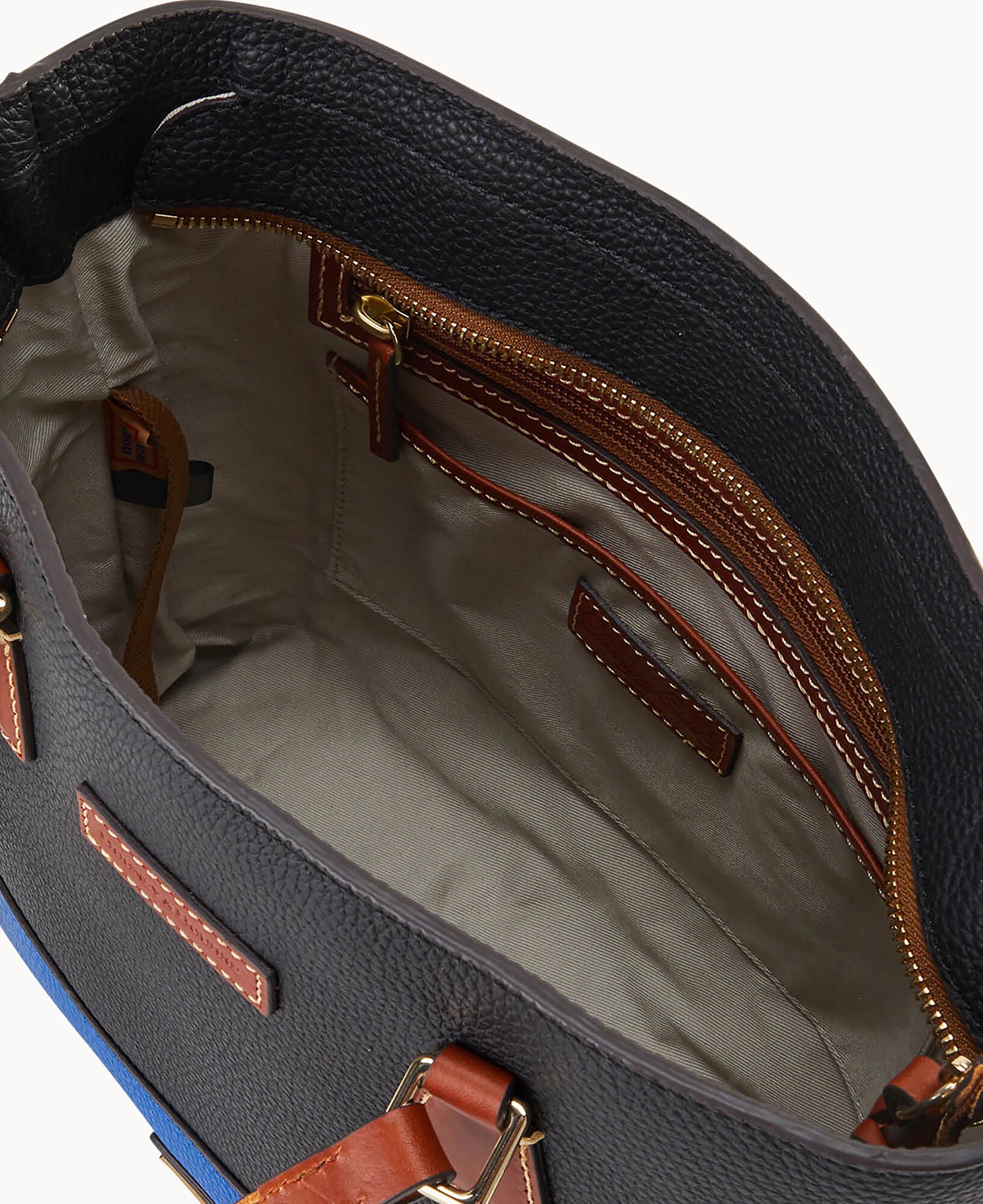 One outside zip pocket. Three inside pockets. One inside zip pocket. One inside key hook. Handle drop length 12″. Zipper closure. Feet. Lined.