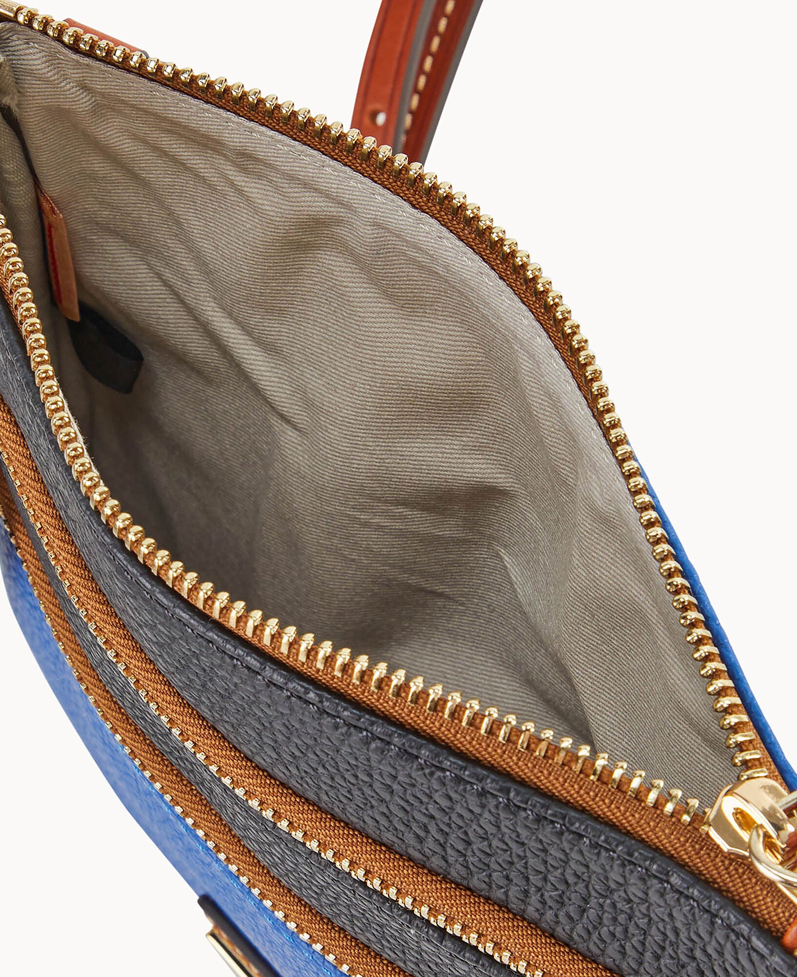 Two outside zip pockets. Cell phone pocket. Adjustable shoulder strap. Strap drop length 24″. Lined. Zipper closure.