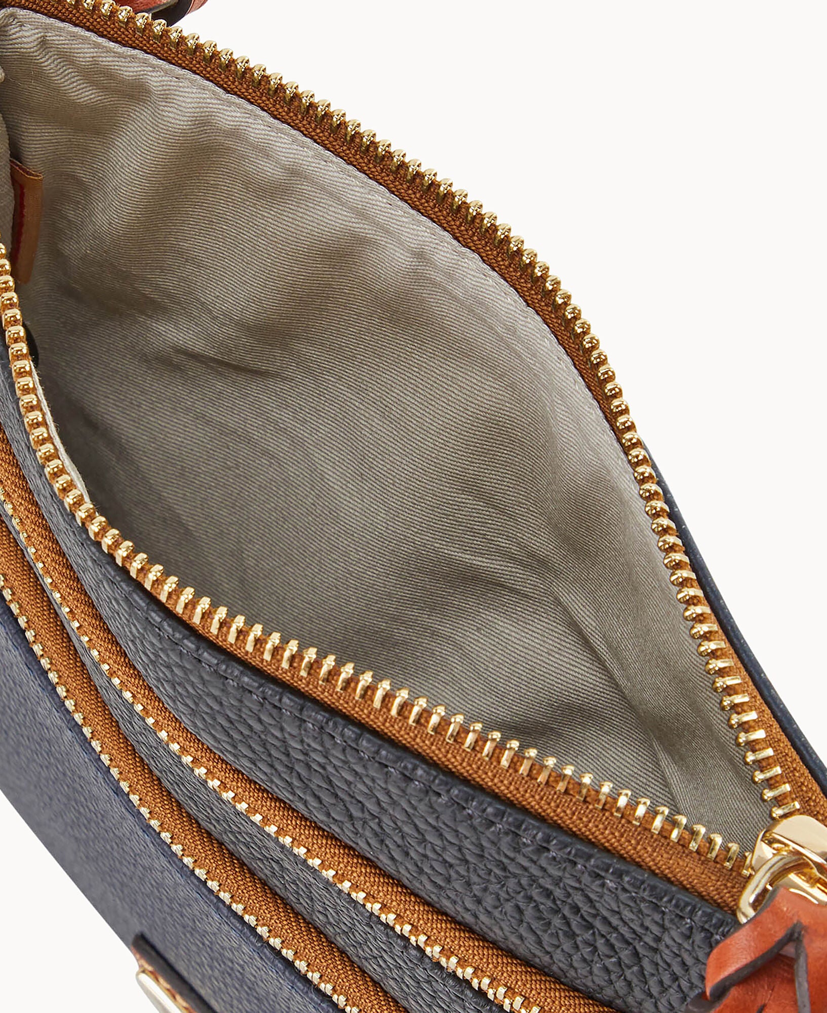 Two outside zip pockets. Cell phone pocket. Adjustable shoulder strap. Strap drop length 24″. Lined. Zipper closure.