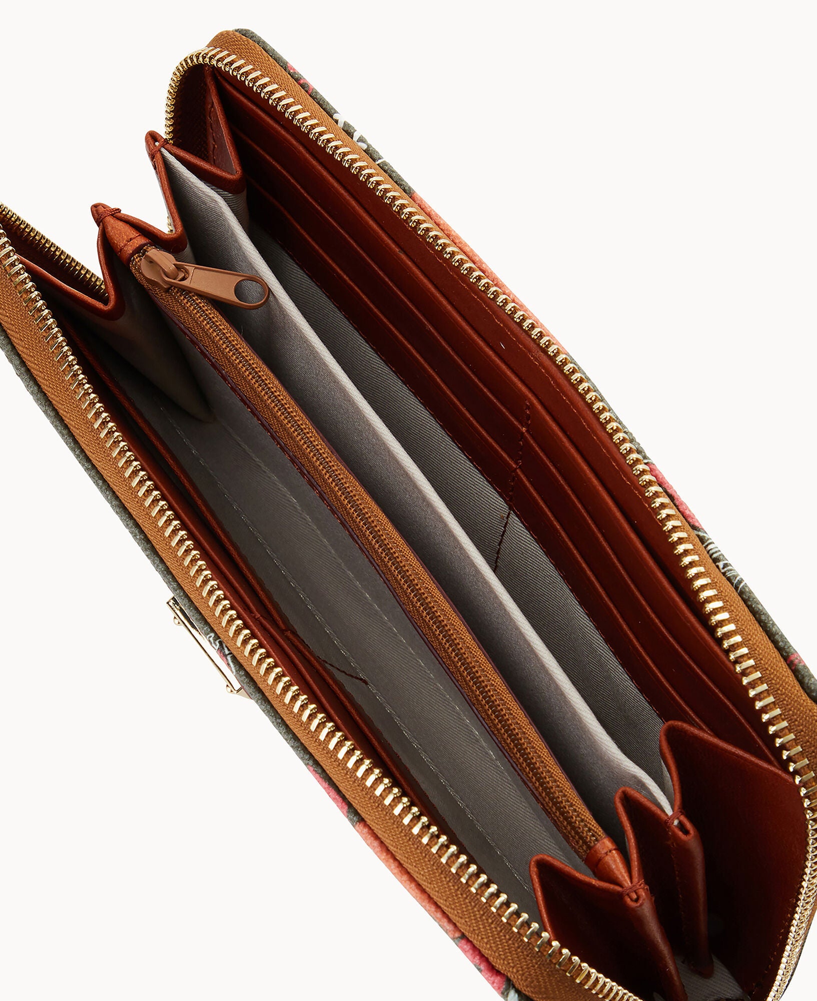 Two compartments. One zip compartment. Twelve credit card slots. Detachable wrist strap. Strap length 7″. Lined. Zipper closure.