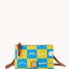 Two inside slip pockets. Inside key hook. Strap drop length 11″. Lined. Feet. Zipper closure.