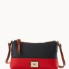 One outside zip pocket. One inside zip pocket. Two inside pockets. Inside key hook. Strap drop length 11″. Lined. Feet. Zipper closure.