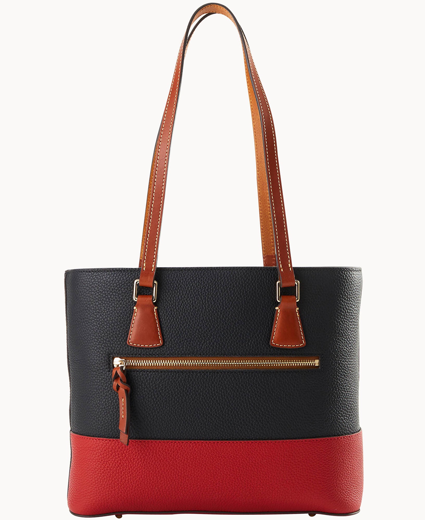 One outside zip pocket. Three inside pockets. One inside zip pocket. One inside key hook. Handle drop length 12″. Zipper closure. Feet. Lined.