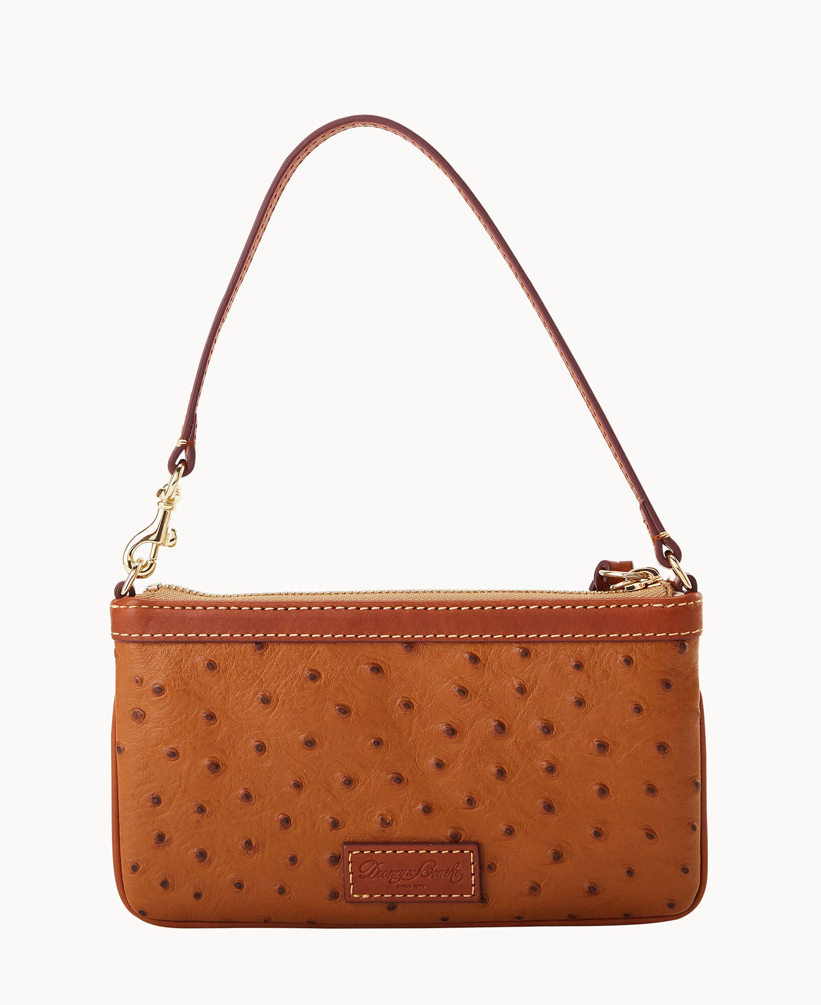 One inside pocket. Adjustable handle. Handle drop length 6.5″. Adjustable wrist strap. Strap drop length 7″. Lined. Zipper closure.