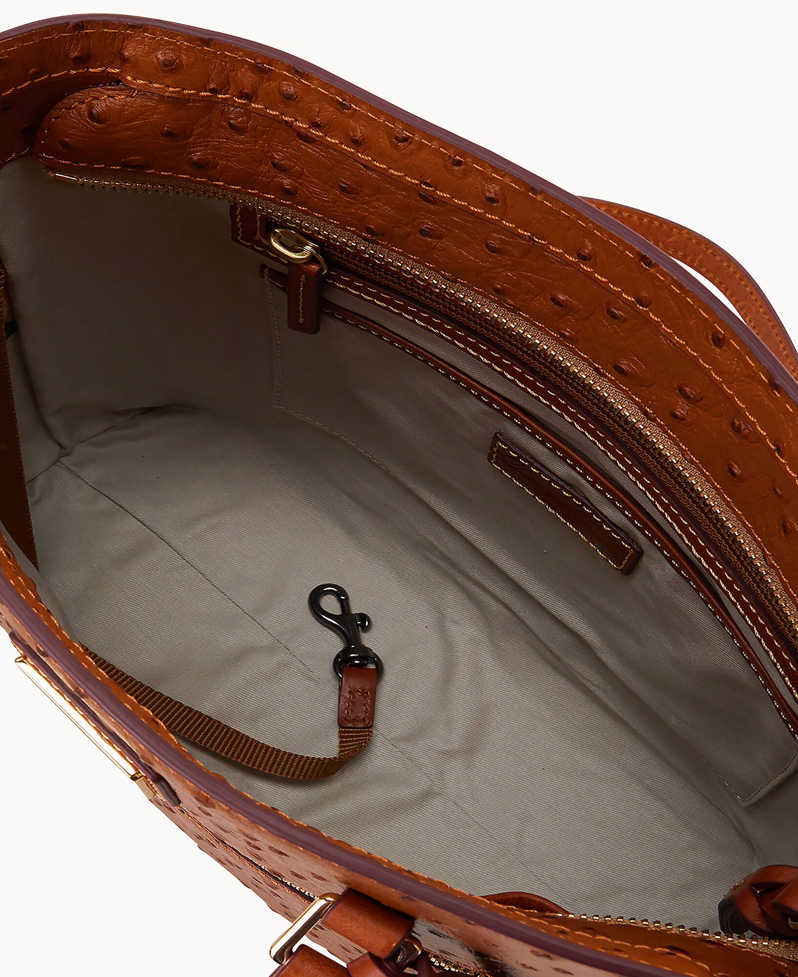 One outside zip pocket. One inside zip pocket. Two inside pockets. Cell phone pocket. Inside key hook. Strap drop length 11.5″. Feet. Zipper closure.