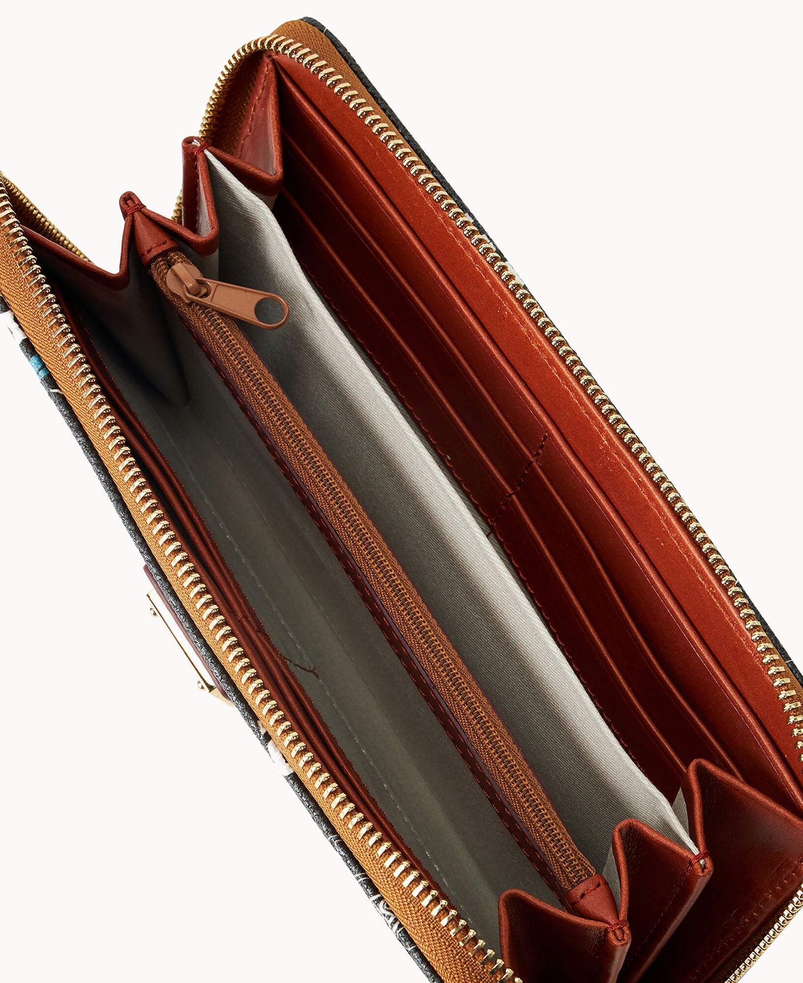 Two compartments. One zip compartment. Twelve credit card slots. Detachable wrist strap. Strap length 7″. Lined. Zipper closure.