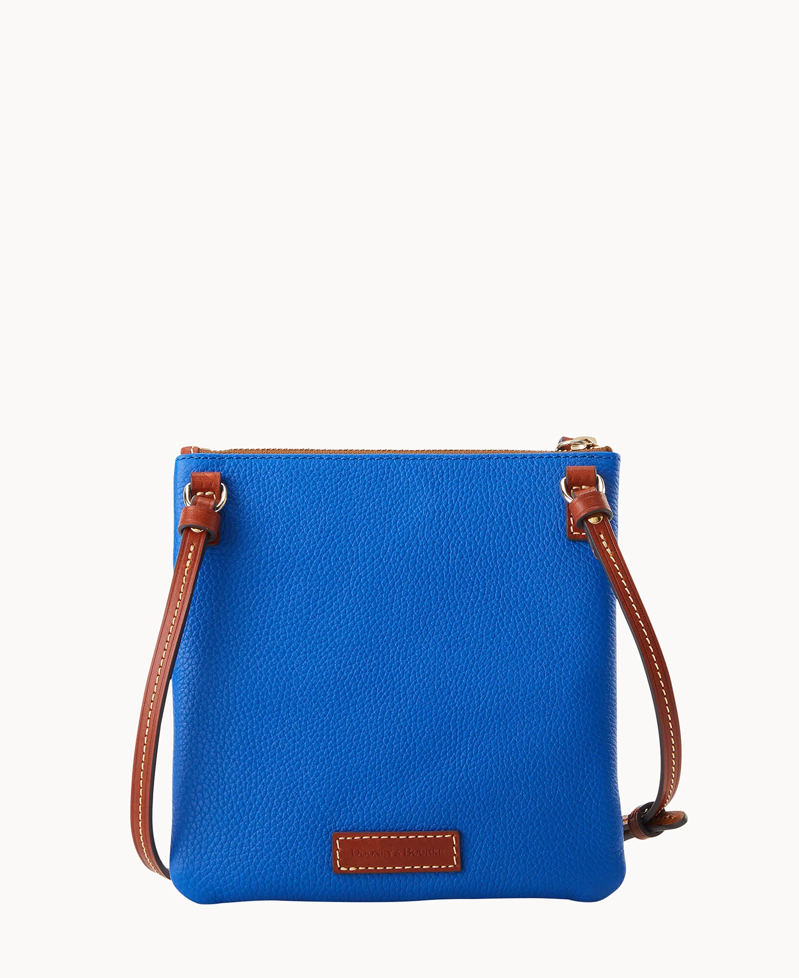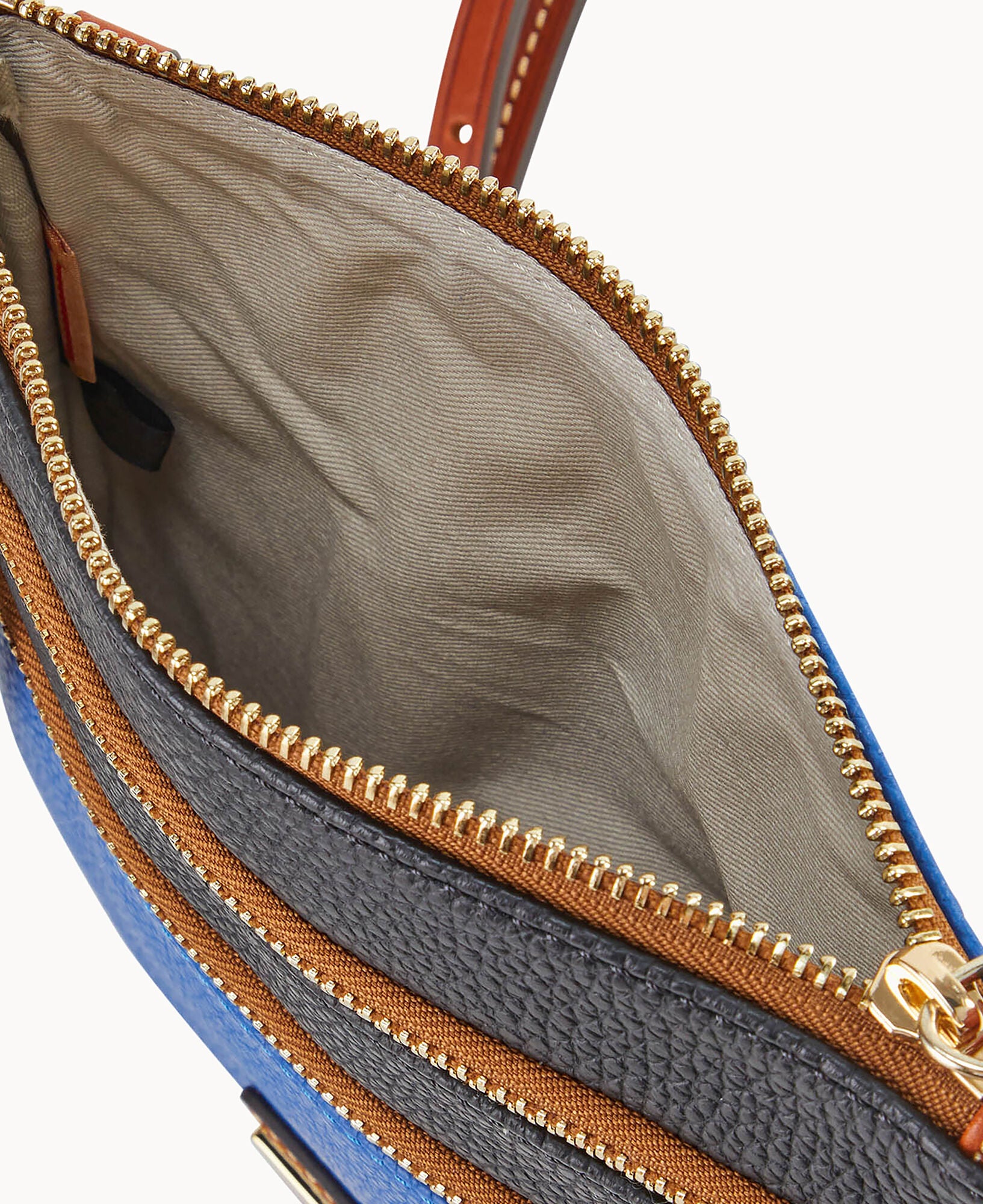 Two outside zip pockets. Cell phone pocket. Adjustable shoulder strap. Strap drop length 24″. Lined. Zipper closure.