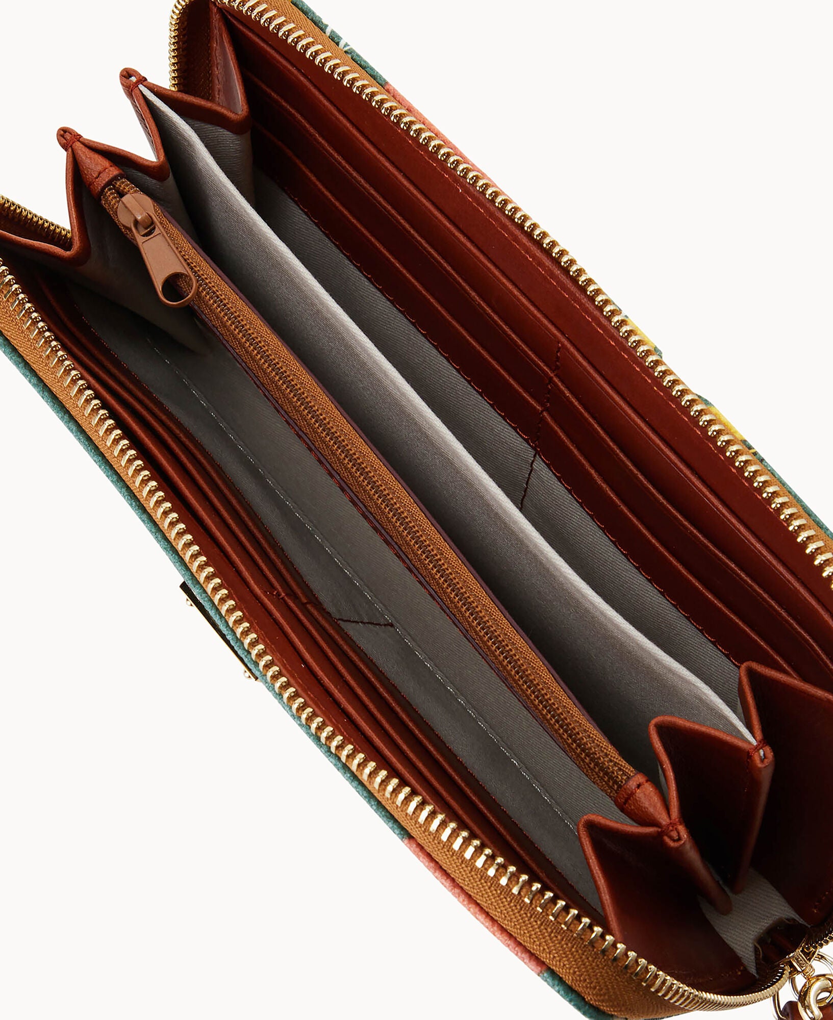Two compartments. One zip compartment. Twelve credit card slots. Detachable wrist strap. Strap length 7″. Lined. Zipper closure.