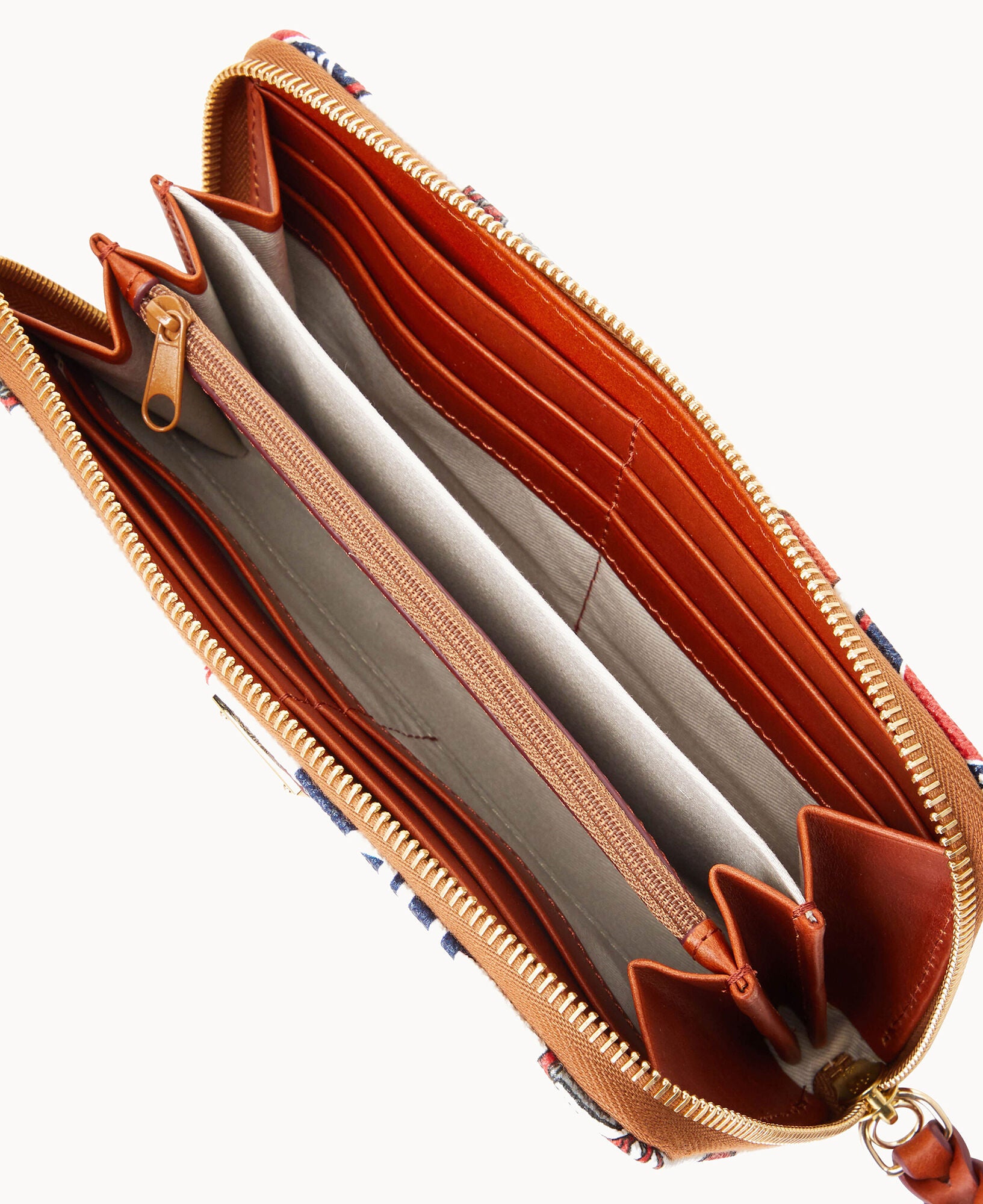 Two compartments. One zip compartment. Twelve credit card slots. Detachable wrist strap. Strap length 7″. Lined. Zipper closure.