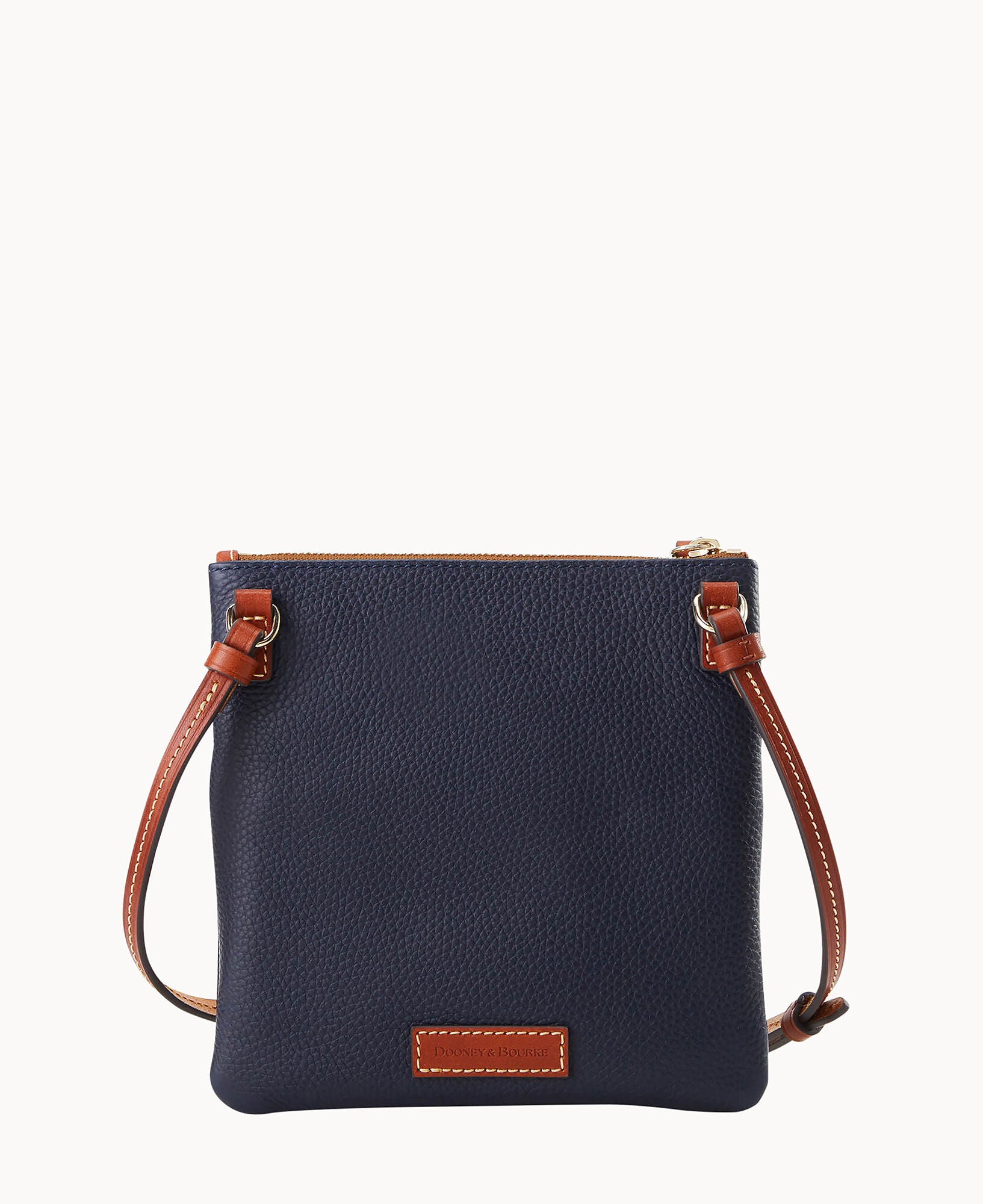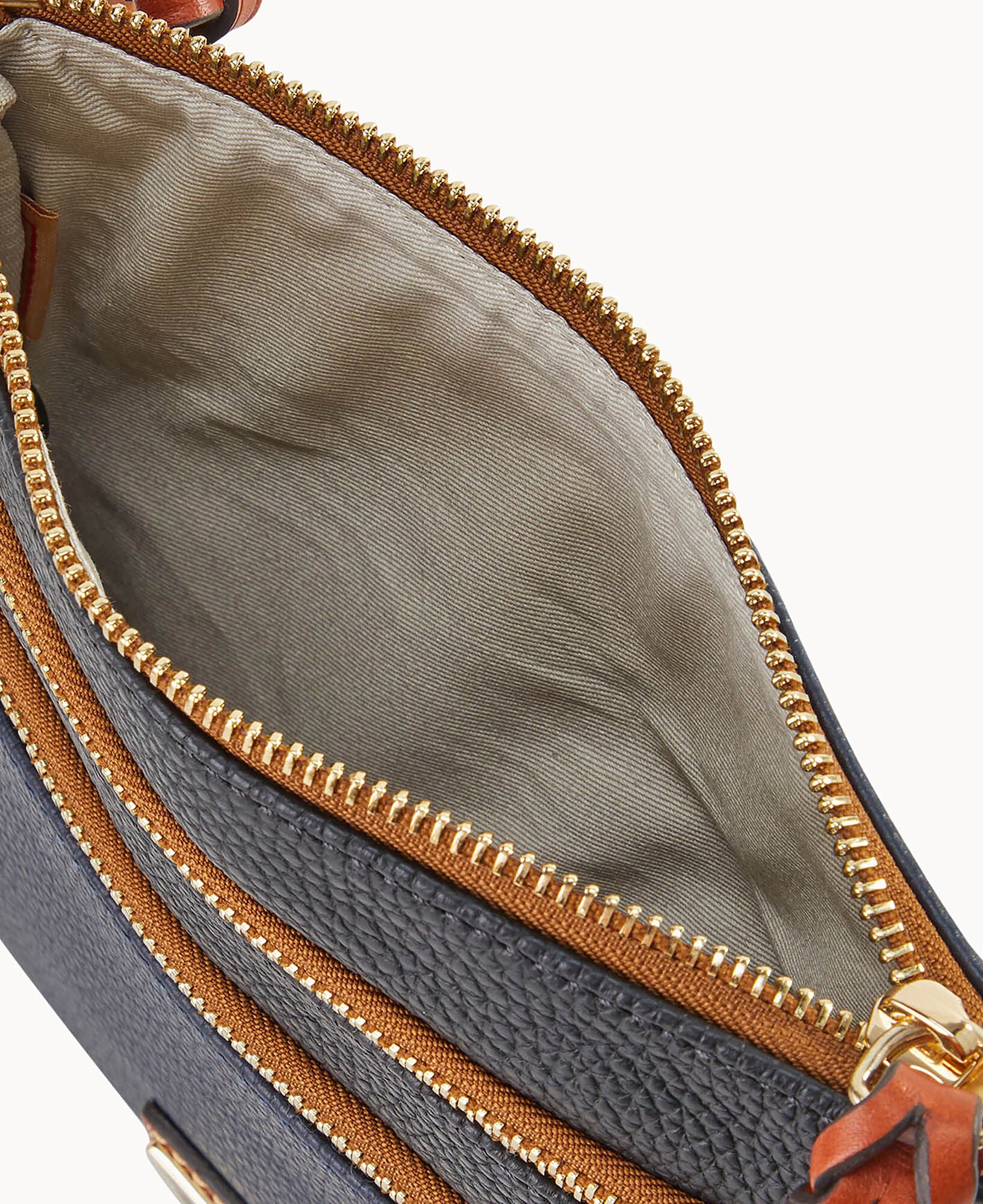 Two outside zip pockets. Cell phone pocket. Adjustable shoulder strap. Strap drop length 24″. Lined. Zipper closure.