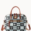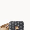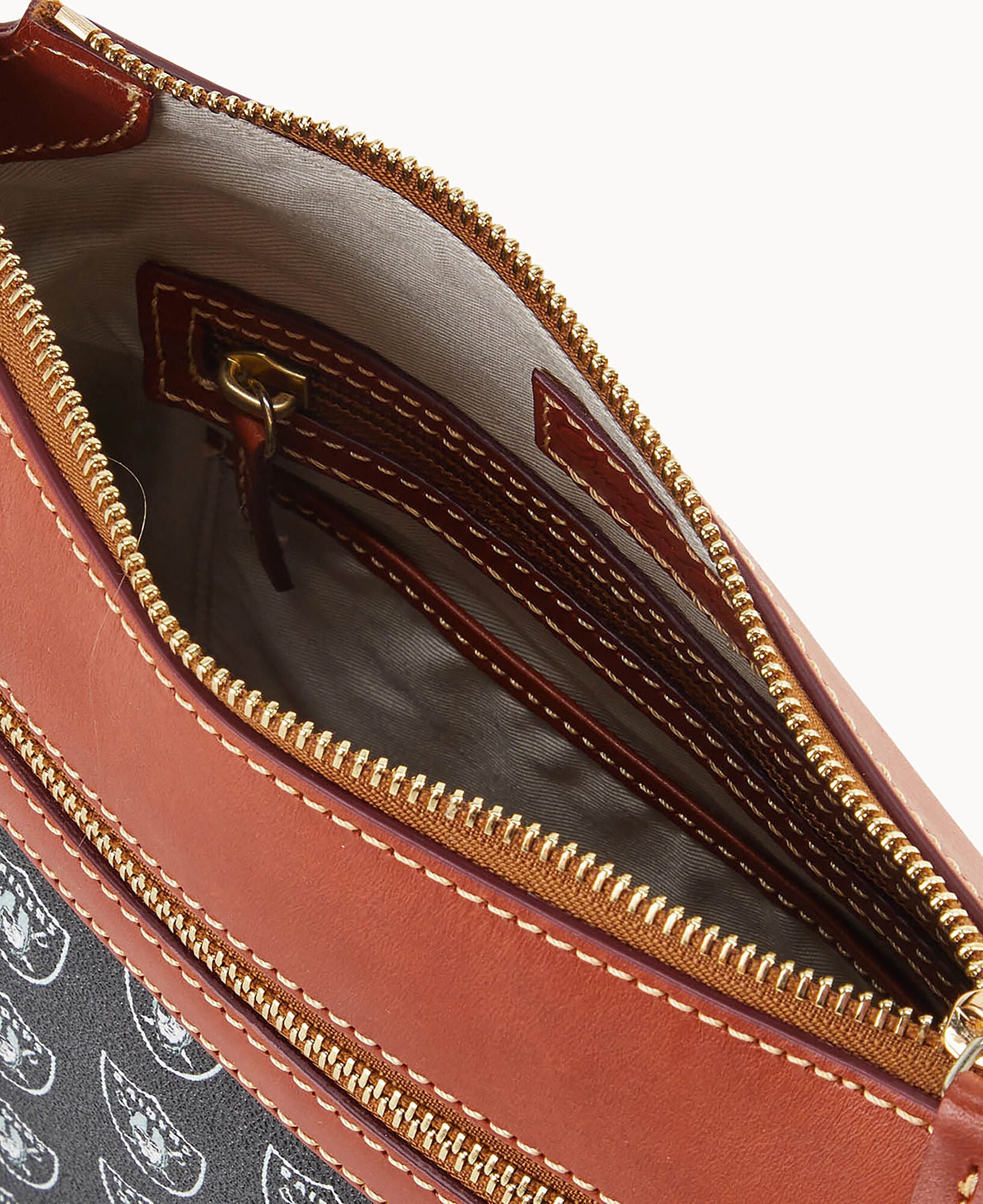 One outside zip pocket. One inside zip pocket. Two inside pockets. Adjustable, detachable shoulder strap. Strap drop length 27″. Inside key hook. Lined. Zipper closure.