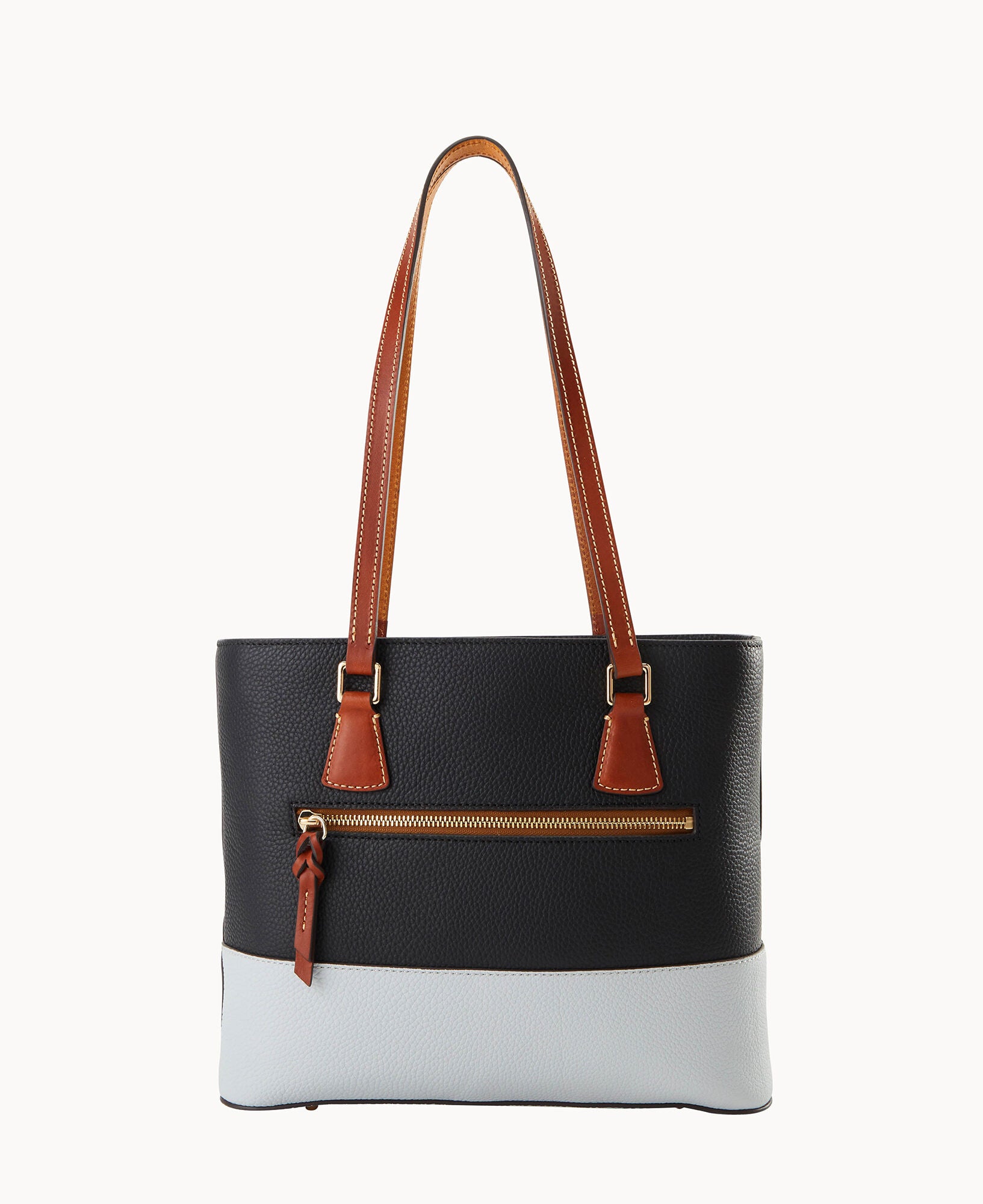 One outside zip pocket. Three inside pockets. One inside zip pocket. One inside key hook. Handle drop length 12″. Zipper closure. Feet. Lined.