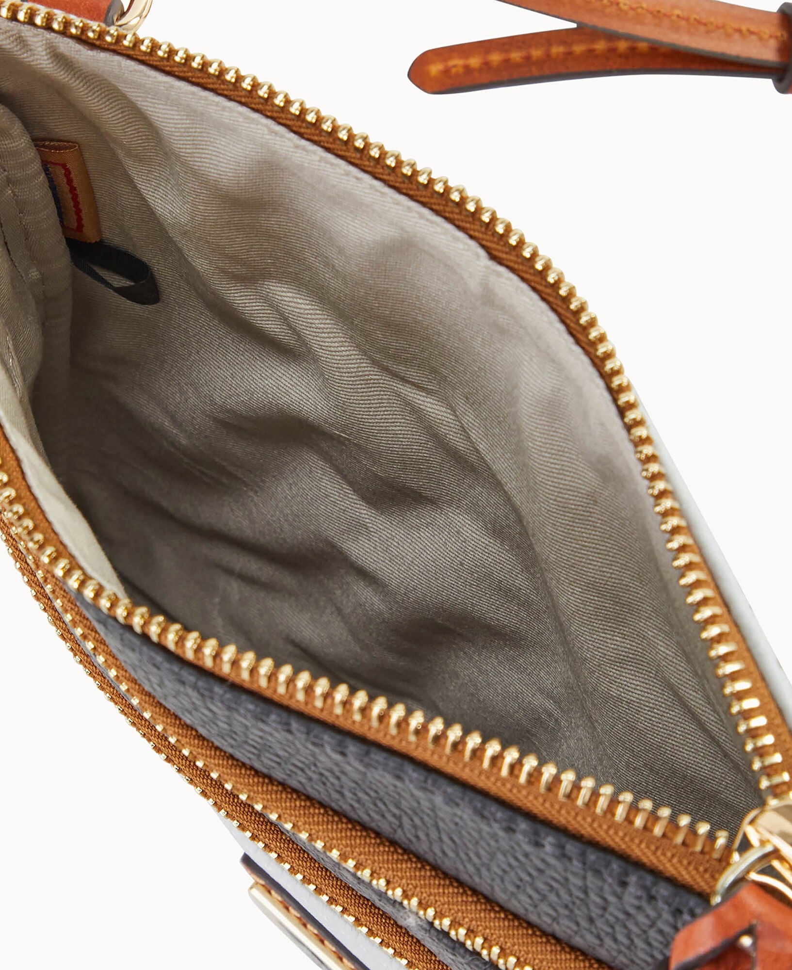 Two outside zip pockets. Cell phone pocket. Adjustable shoulder strap. Strap drop length 24″. Lined. Zipper closure.