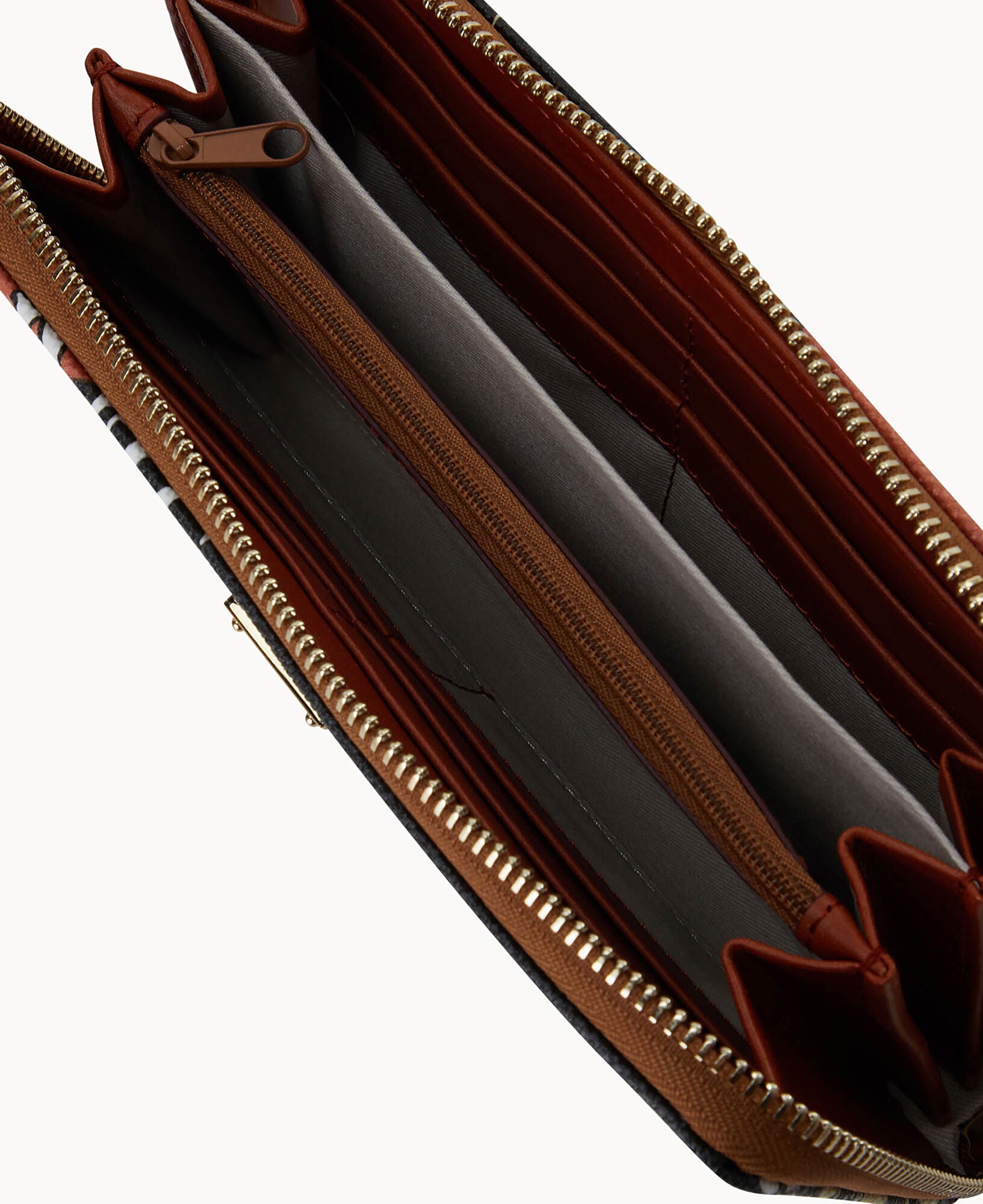 Two compartments. One zip compartment. Twelve credit card slots. Detachable wrist strap. Strap length 7″. Lined. Zipper closure.