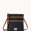 One inside zip pocket. Two inside pockets. Cell phone pocket. Inside key hook. Strap drop length 21″. Lined. Feet. Zipper closure.