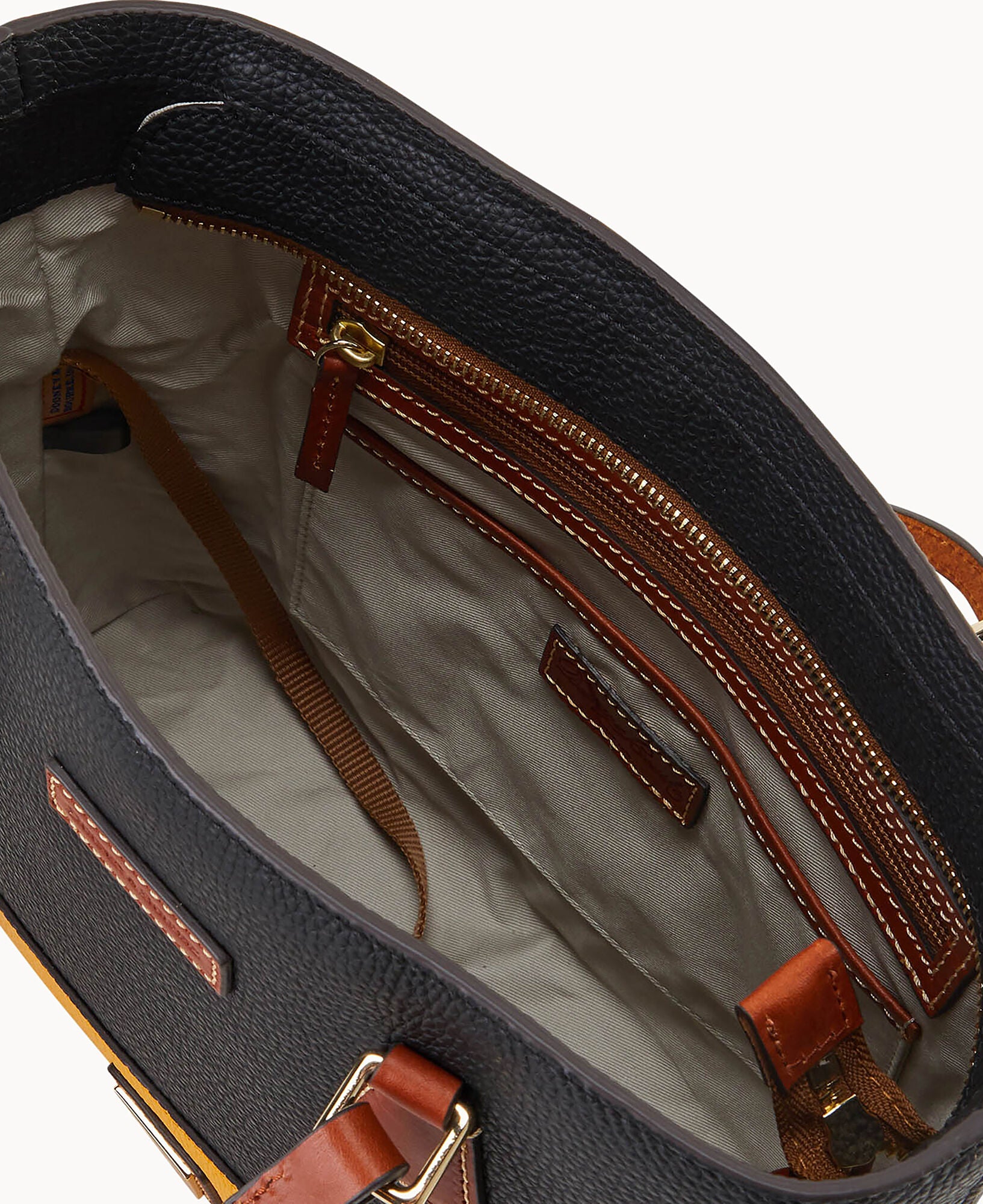 One outside zip pocket. Three inside pockets. One inside zip pocket. One inside key hook. Handle drop length 12″. Zipper closure. Feet. Lined.