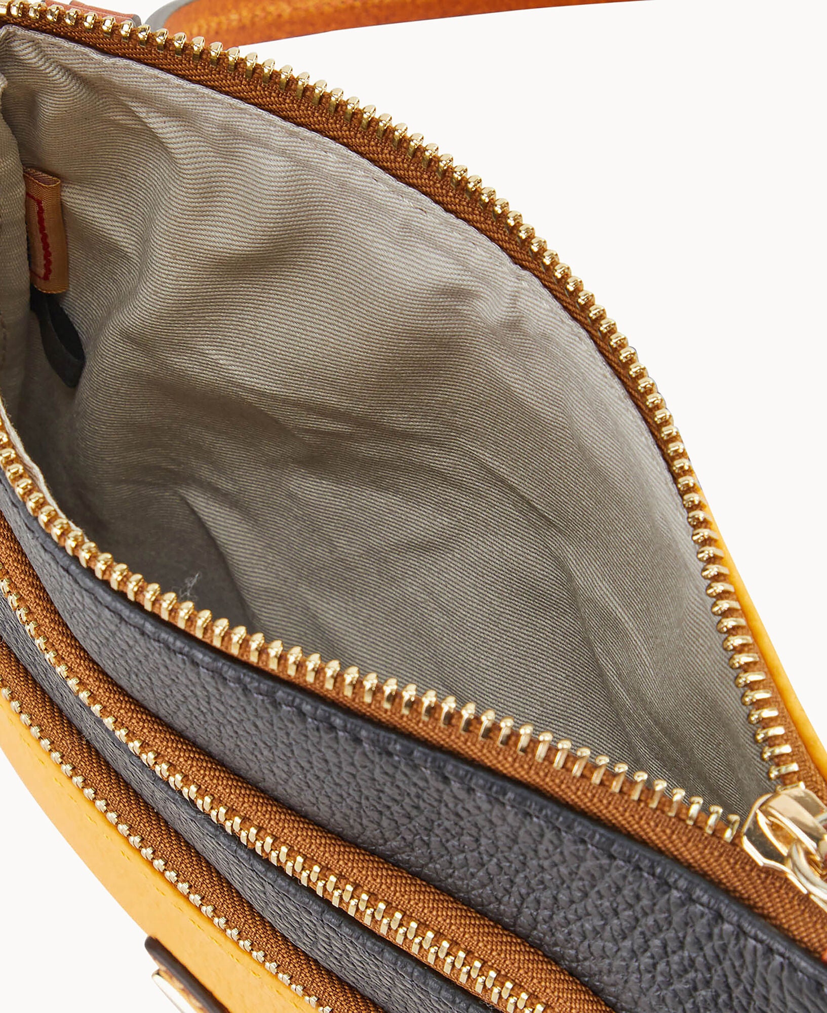 Two outside zip pockets. Cell phone pocket. Adjustable shoulder strap. Strap drop length 24″. Lined. Zipper closure.