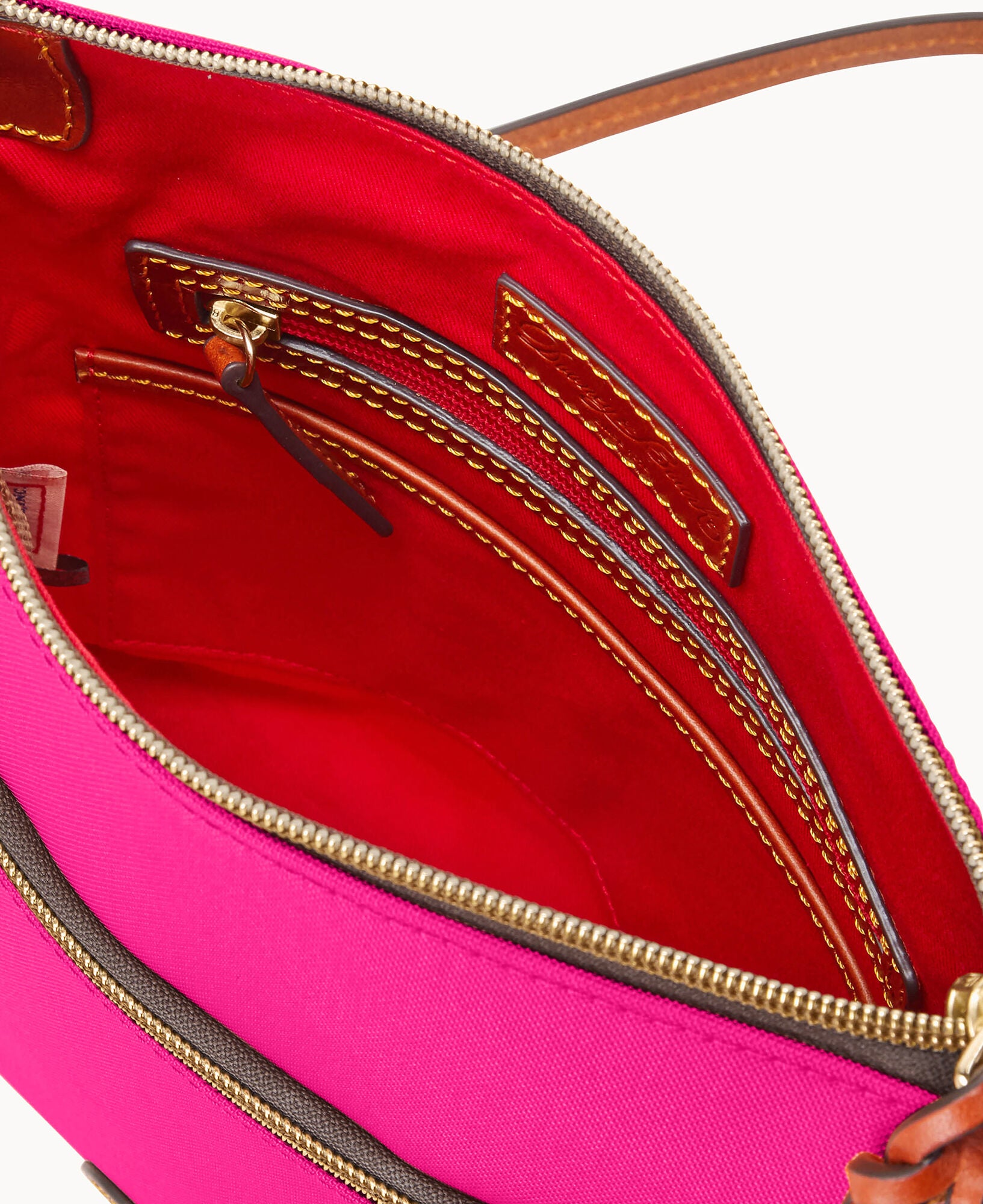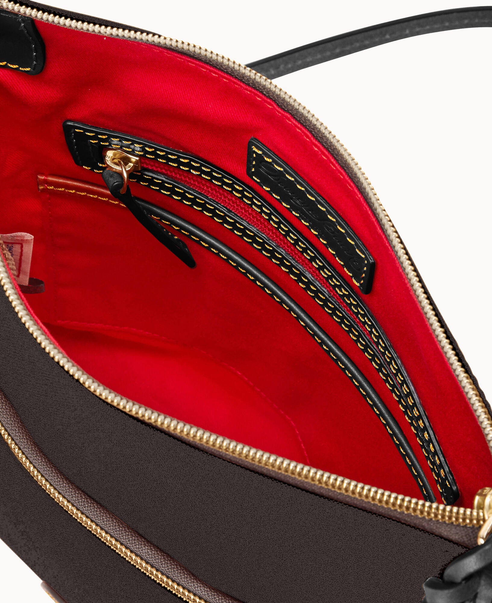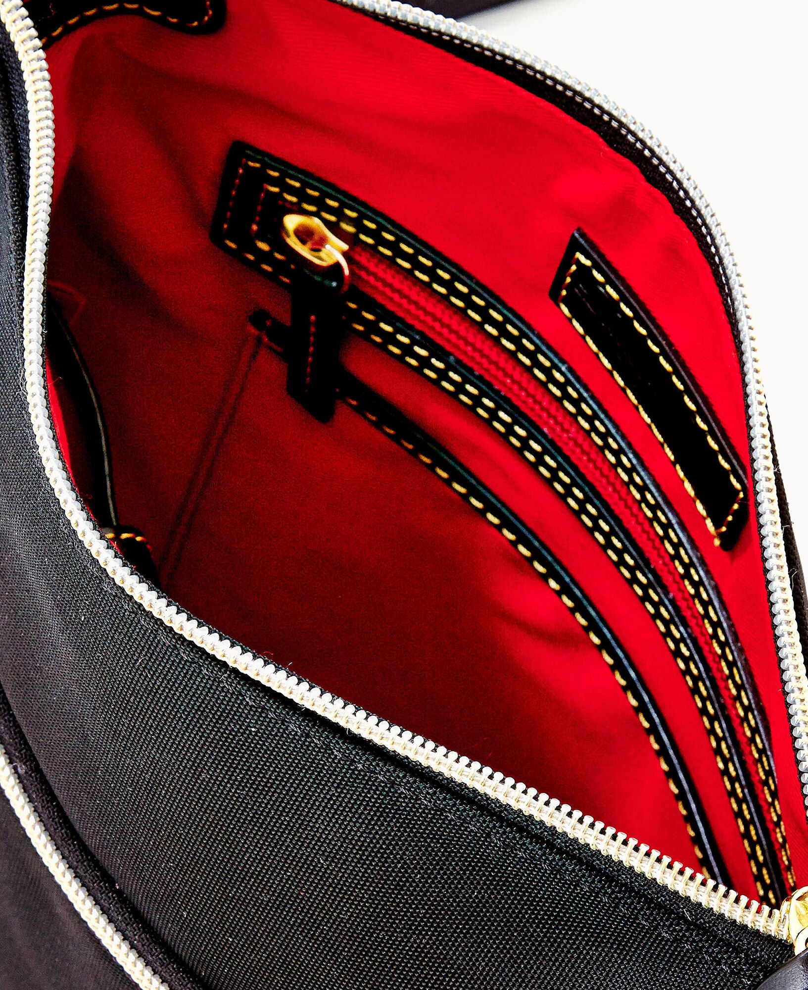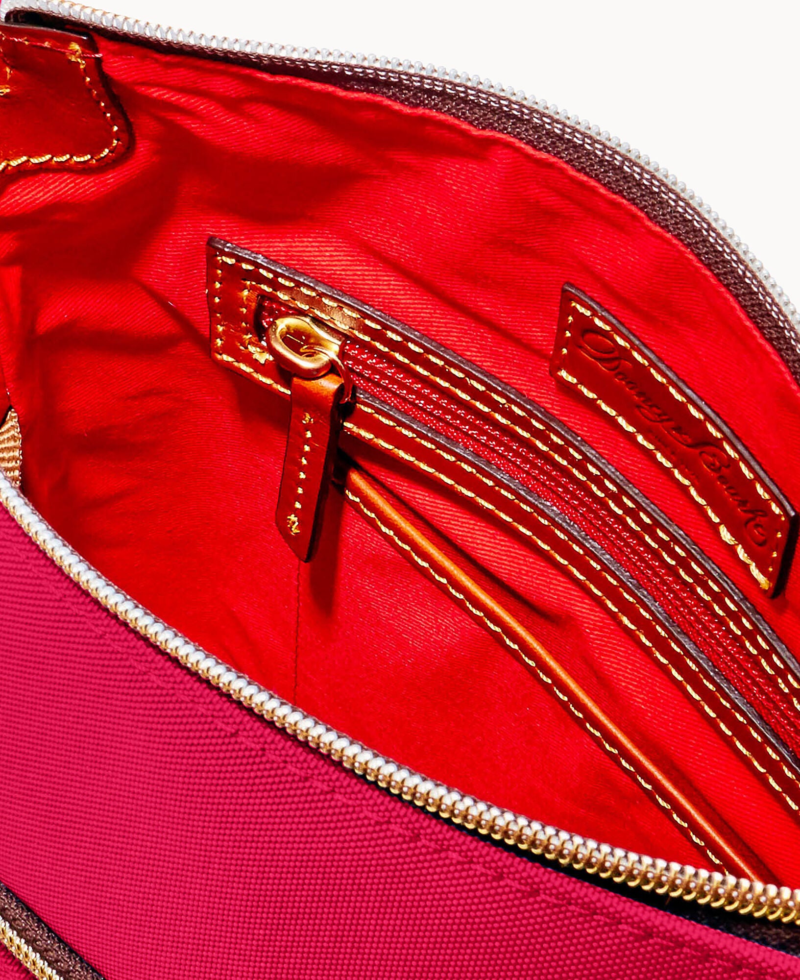 One outside zip pocket. One inside zip pocket. Two inside pockets. Cell phone pocket. Inside key hook. Adjustable shoulder strap. Strap drop length 25″. Lined. Zipper closure.