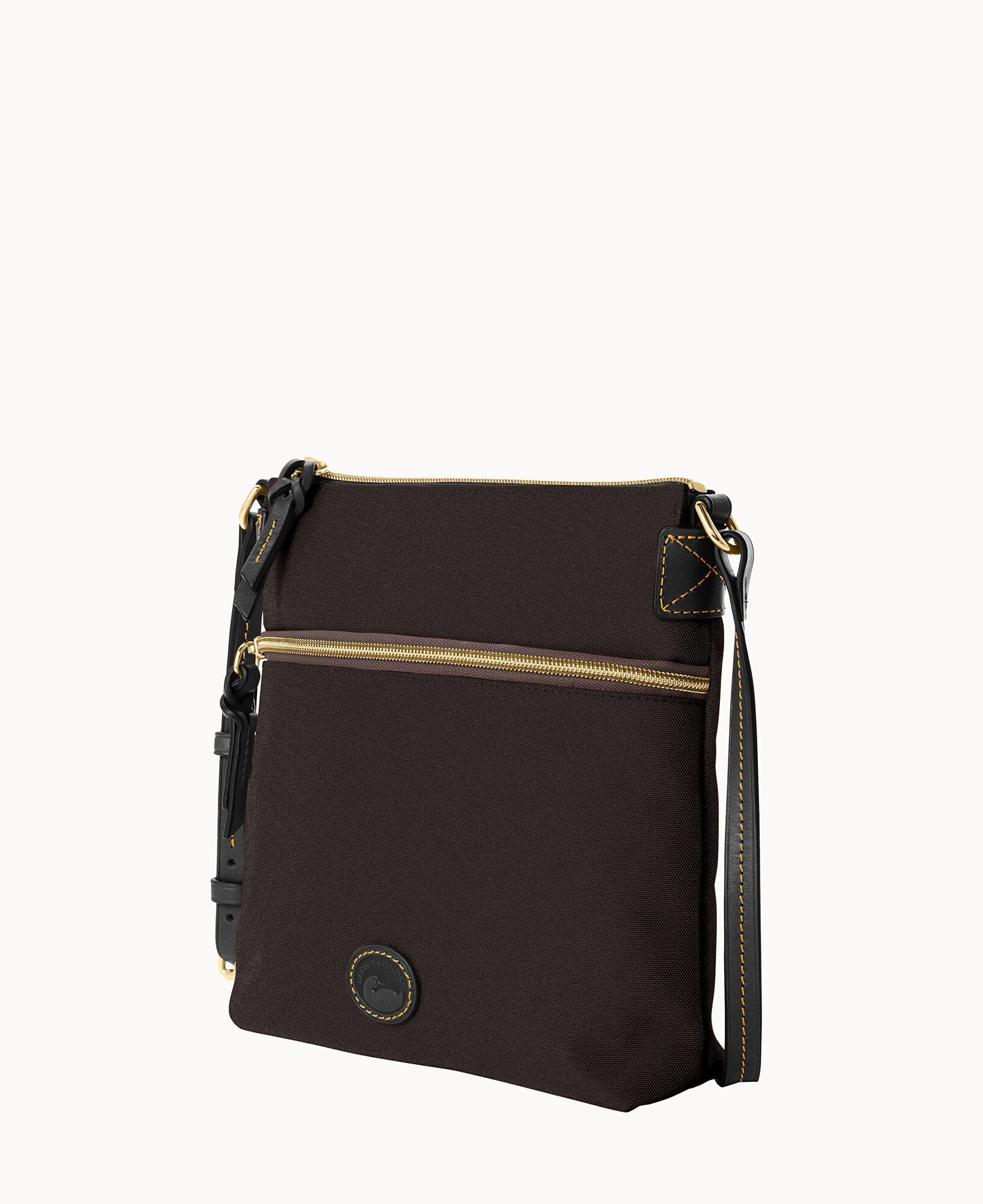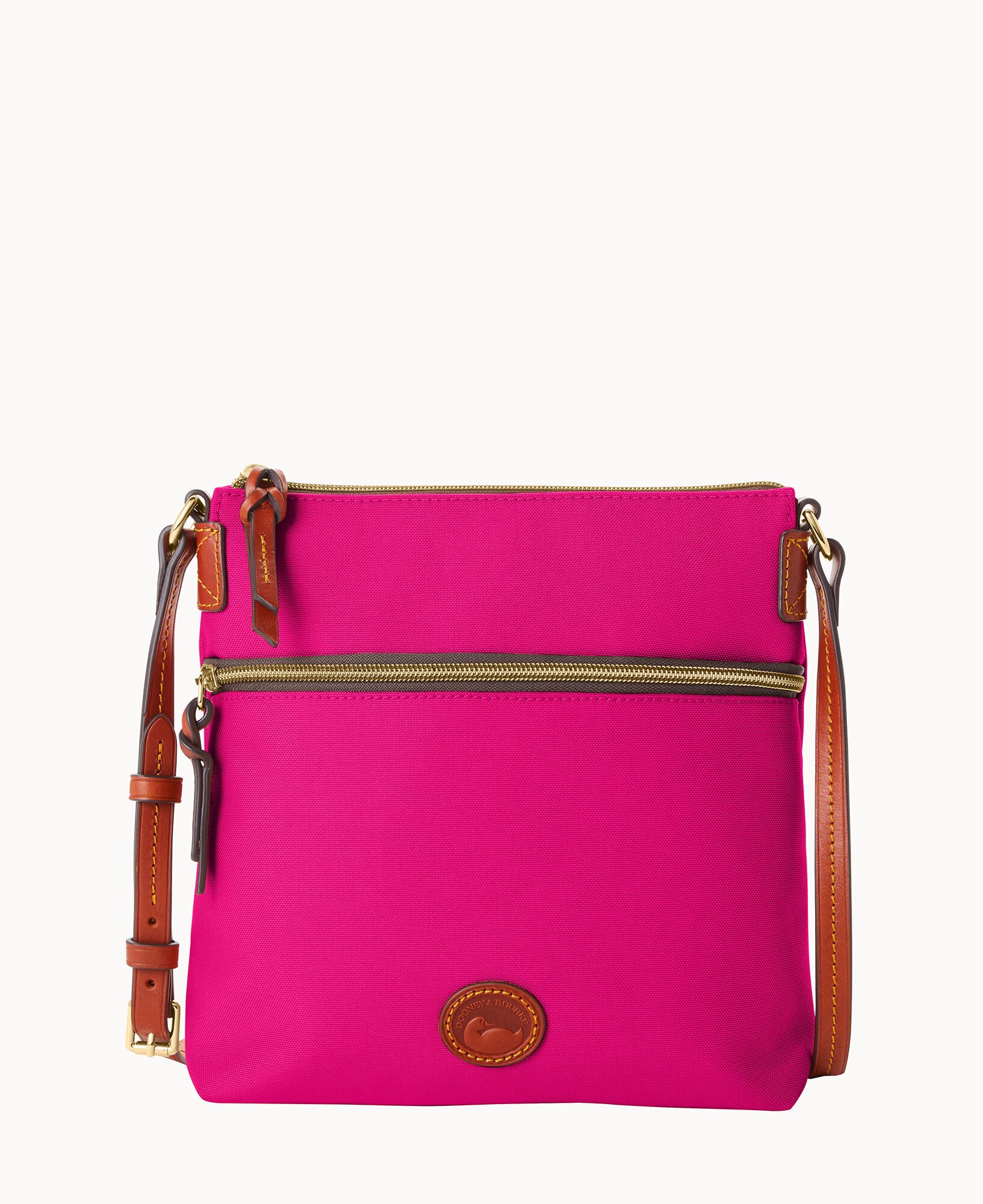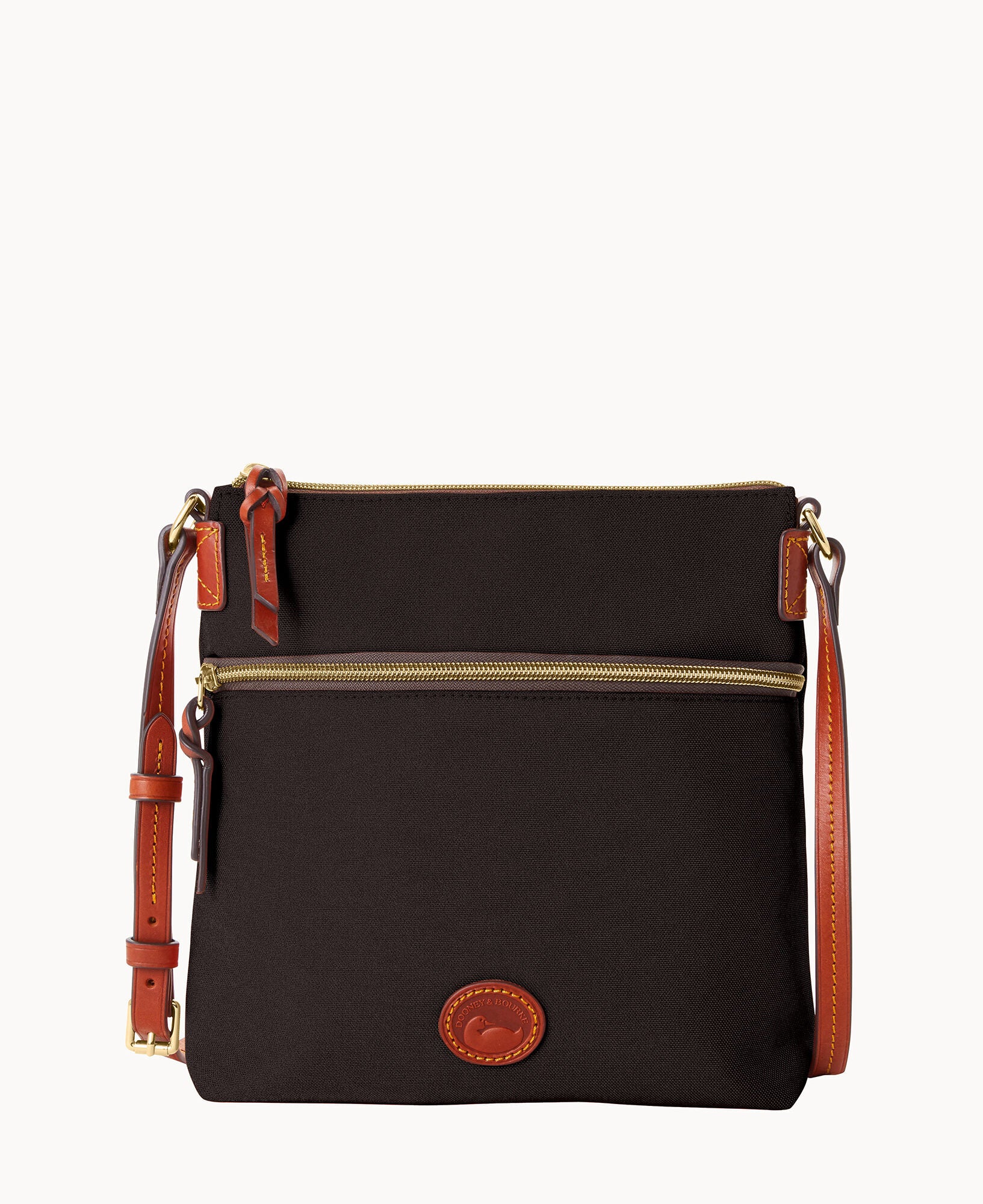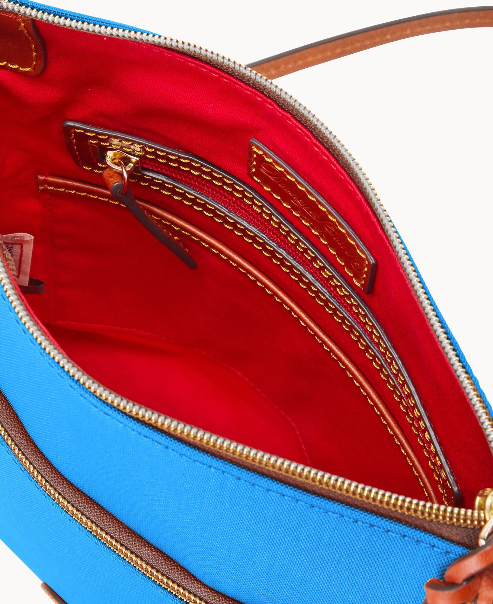 One outside zip pocket. One inside zip pocket. Two inside pockets. Cell phone pocket. Inside key hook. Adjustable shoulder strap. Strap drop length 25″. Lined. Zipper closure.